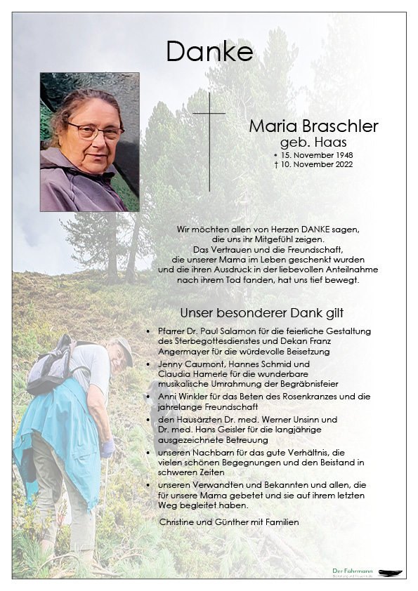 Wir sind traurig,dass du gingst,aber dankbar,dass es dich gab.Unsere Gedanken kehren in liebe immer zu dir zurück.Liebe Trauerfamilie wir wünschen euch in dieser schweren Zeit viel Kraft.Danke Maria für die gute Nachbarschaft werden dich vermissen.Alois Maria u. Lukas