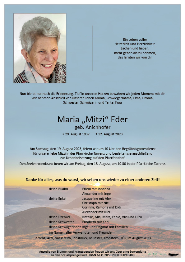 "Das Wesentliche ist für die Augen unsichtbar, man sieht nur mit dem Herzen gut". Mitzi war eine Frau mit einem offenen Herzen, sie lebte genau danach. Niemals werde ich ihre humorvolle und optimistische Art vergessen. Wie sehr freuten wir uns in der Ordination Dr. Strauß, wenn sie uns frischen Plunder mitbrachte. Das ist nur eine, von vielen schönen Erinnerungen, die ich an Mitzi habe. Viele Menschen in Tarrenz und darüber hinaus, werden sie nie vergessen.