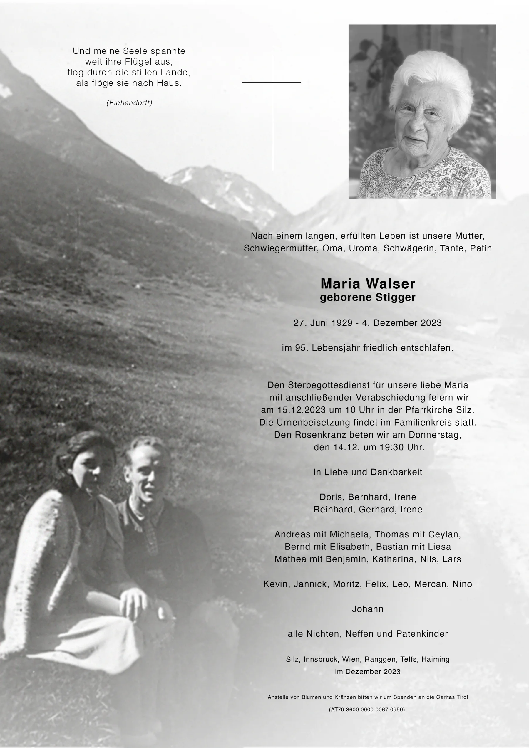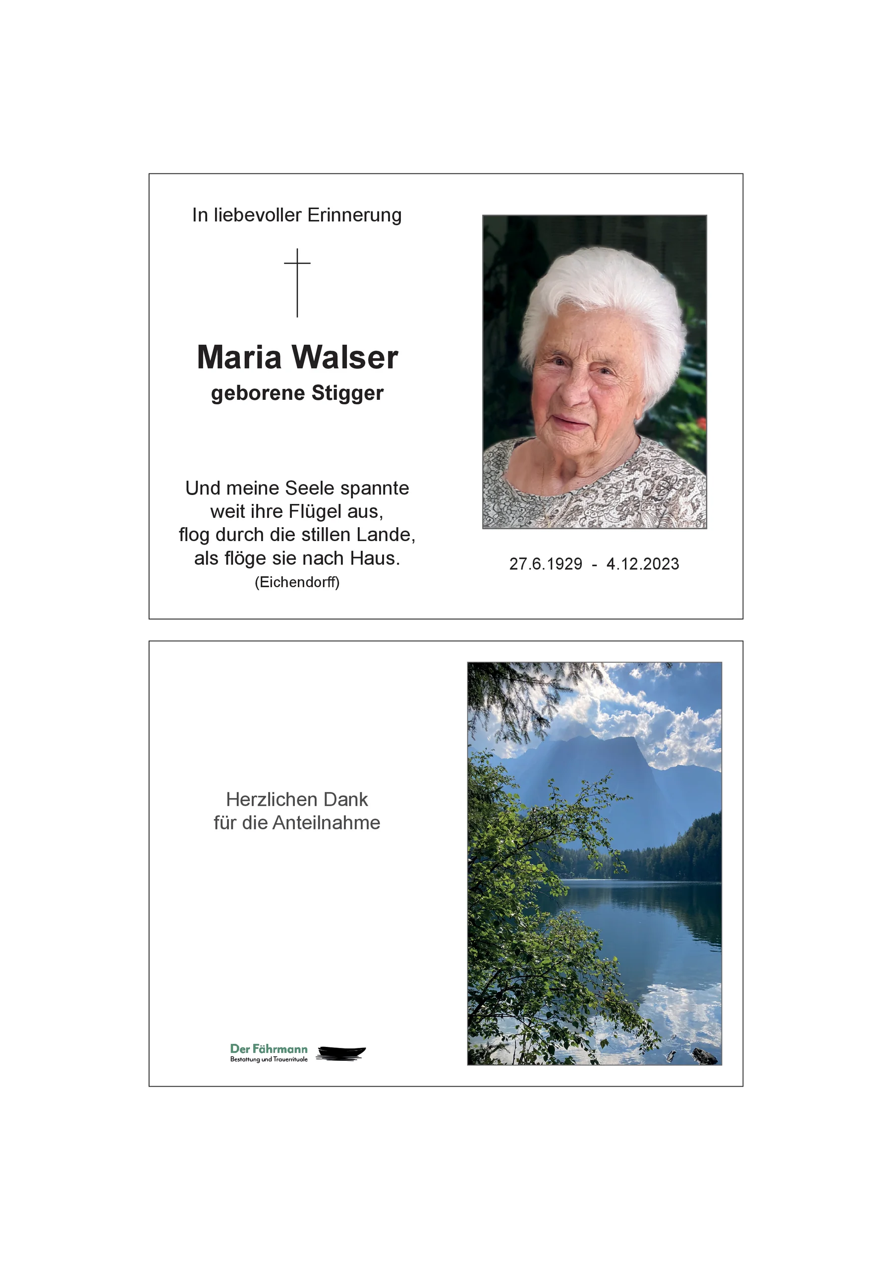 Liebe Doris und Trauerfamilie! Zum Heimgang eurer lieben Mama und Oma möchte ich euch mein Mitgefühl zum Ausdruck bringen. Mariele war ein wunderbarer, bescheidener und warmherziger Mensch.Habe immer gern mit ihr geratscht und über Hoaming gredet.Werde sie in lieber Erinnerung behalten. Helene m. Familie!