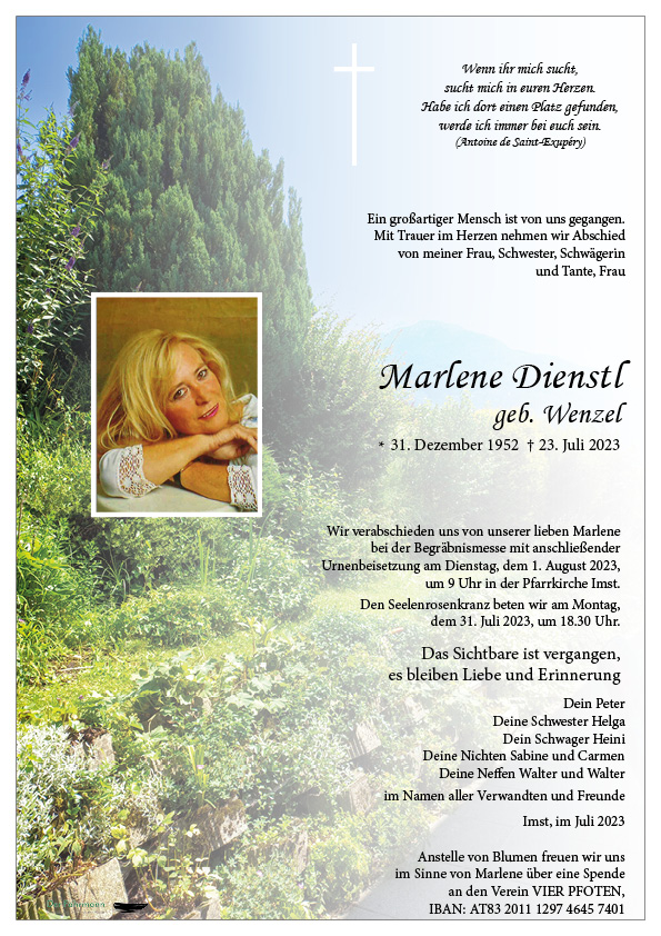 Lieber Peter, geschätzte Trauerfamilie. Wir wissen, was ihr mit dem Heimgang von Marlene verloren habt. Unvergessen bleibt uns Marlene als sympathische, hilfsbereite und jederzeit für einen gemütlichen Huangart bereite Frau. Sie war auch durch ihren Fleiß und ihren Elan ein großes Vorbild. Die Begegnungen mit ihr - vor allem vor vielen Jahren in der Bahnhofsreste Ötztal-Bahnhof bleiben für immer in unseren Herzen. Ruhe sanft Marlene.
