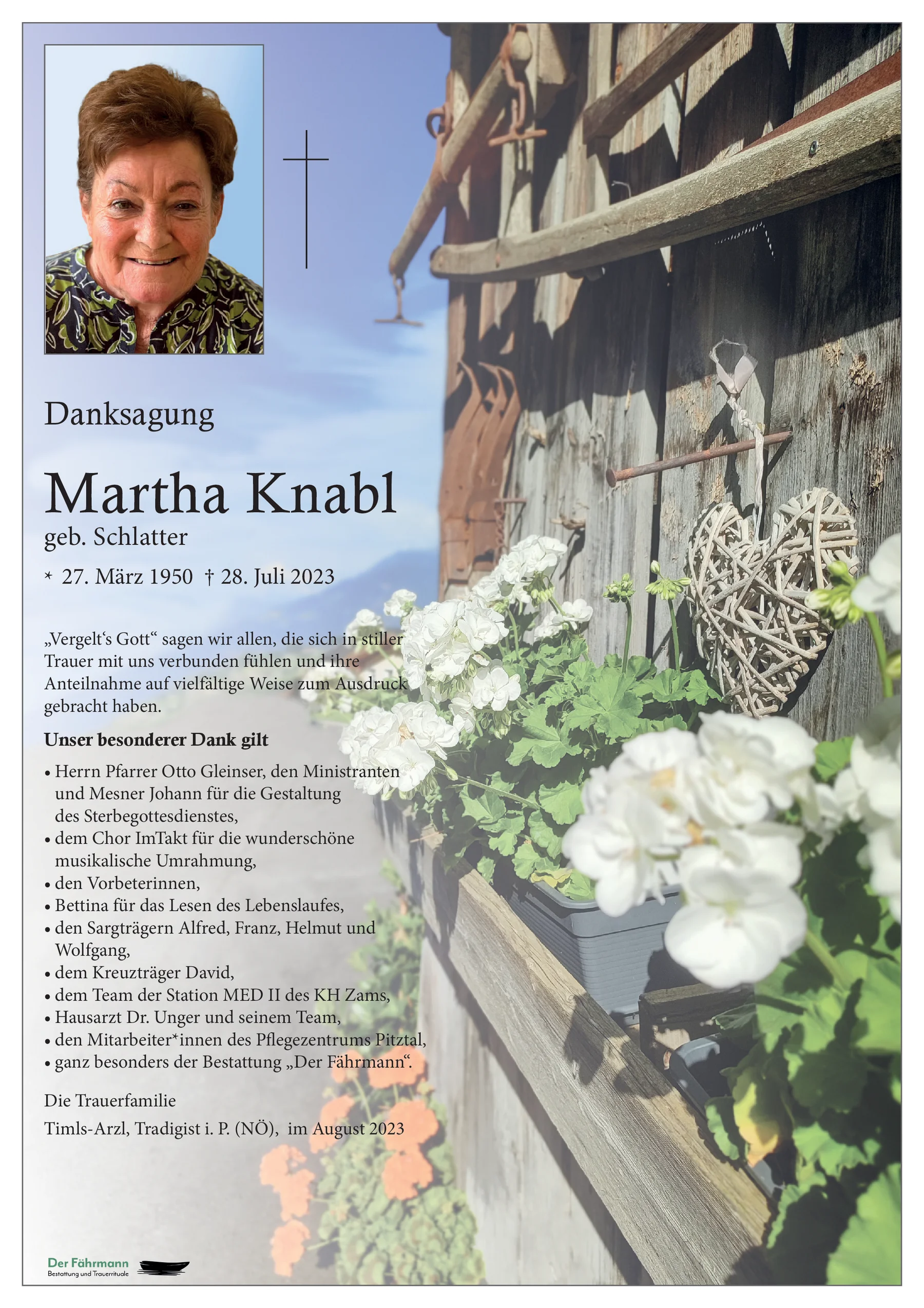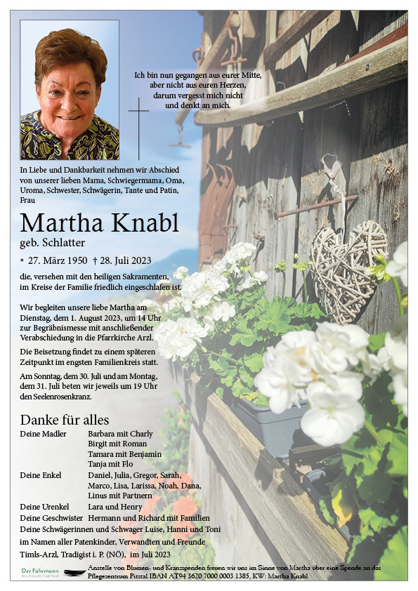 Marth war immer eine liebevolle und wunderbare Frau, die ich sehr vermissen werden. Die vielen schönen Stunden bei euch daheim zaubern mir immer wieder ein Lächeln ins Gesicht und bleiben für immer in Erinnerung