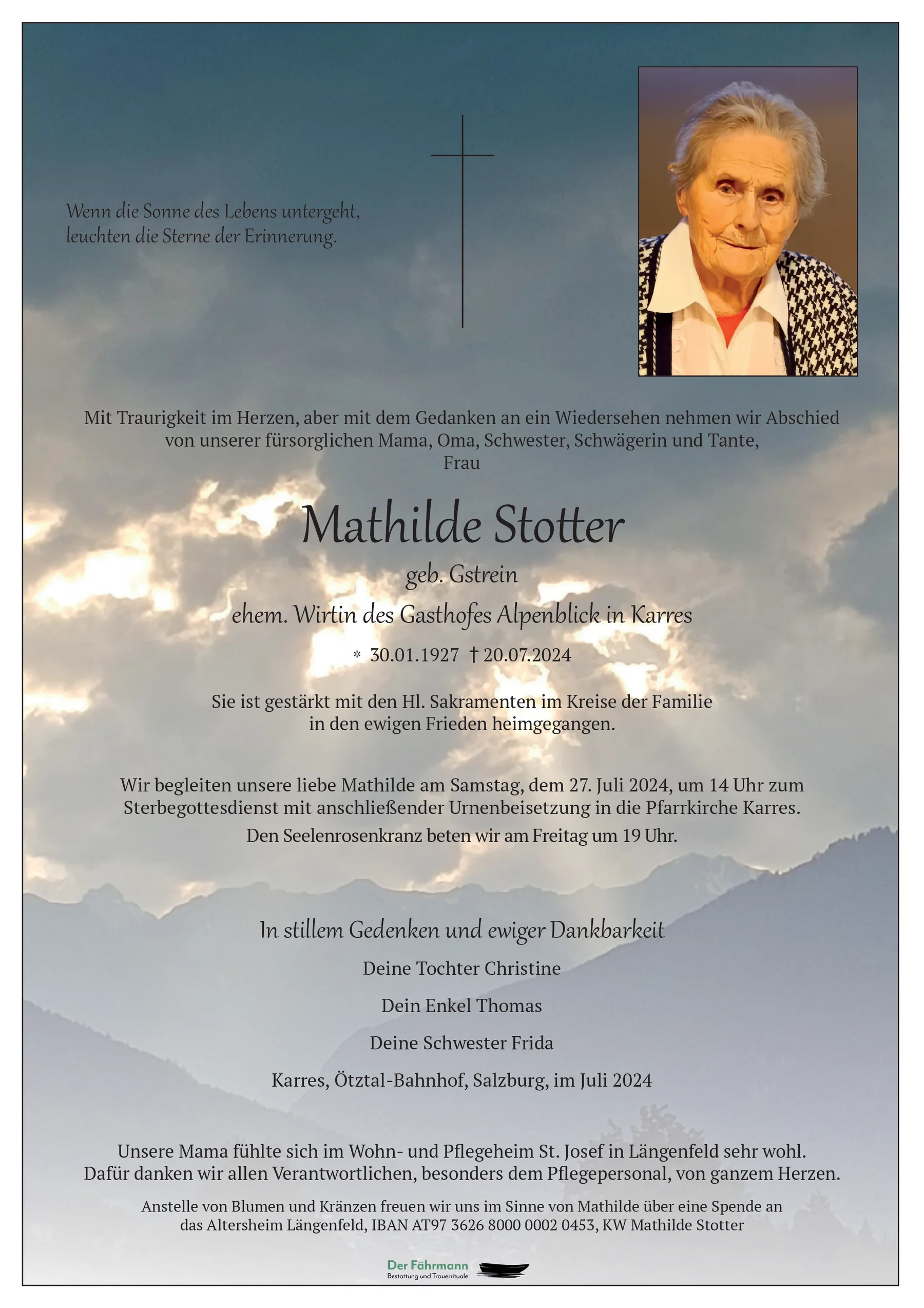 mein Beileid zum Tod deiner Mutter. Es war ihr vergönnt, ein solch langes Leben zu führen. Und was hatte sie alles zu tragen: Von ihren elf Geschwistern blieben nur fünf übrig. Als älteste überlebende Tochter des "Gföllners" wusste sie, wie sie ihr eigenes Gasthaus zu bewerkstelligen hatte, was sie mit deinem Vater Helmut in Karres auch tat. Ihre Liebe zu dir, deinem Sohn und allen anderen auf ihrem Lebensweg, wird auch nach ihrem Tod weiterleben. Während wir um sie trauern, darf deine Mama nun zu deinen Geschwistern, deinem Papa, ihren zehn vorausgegangen Geschwistern, insbesondere Walter, ihren Eltern Josef & Augusta sowie allen, die bereits an der Himmelspforte auf sie warten, hinauf. Dir, deinem Thomas und Tante Frida viel Kraft in dieser schwierigen Zeit.