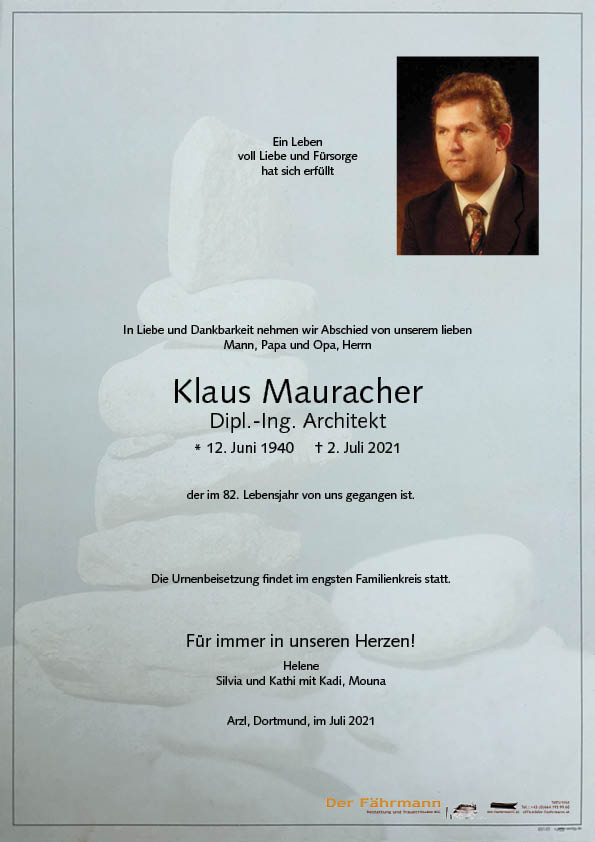 Mauracher Klaus 12.06.1940 02.07.2021 Arzl i.P. Beisetzungs-Ort: Friedhof Arzl i.P. Parte Gedenkkerzen Kondolenzen Parte downloaden Gedenkkerzen für Mauracher Klaus 39 Einträge Kerze anzünden Purt Elisabeth Aufrichtiges Beileid Hans und Maria Pixner Harald Plattner mit Familie Annemarie und Paul van Ooijen Aufrichtige Anteilnahme Monika Hechenblaickner Aufrichtige Anteilnahme, Fam. Irmtraud Schrott Isolde Fleischmann Werner und Michi Stangl Fam. Wilfried u. Dagmar Flir Fam. Markus &Connie Boldt Herrliche Anteilnahme Karlheinz und Barbara Ruhe in Frieden Peter und Marina Schillfahrt Fam. Matthias Rietzler Ruhe in Frieden Familie Strobl Familie Neururer, Rosmarie, Gerold und Daniel In bleibender Erinnerung Sepp Friedl Hannes und Angelika Grabenweger Aufrichtige Anteilnahme, Katrin vom Hair & Style Salon Theres und Martin Sattlecker mit Familie Franz Staggl, Hotel Arzlerhof Martina Demml Herzliche Anteilnahme. Familie Kopp Dietmar Andrea, Jenny und Fabian Marlene Ruhe in Frieden Fam Deutschmann Elisabeth und Sebastian Schennach Team Laurentius-und Pitztalapotheke Aufrichtige Anteilnahme Sabine Andrea, Jenny und Fabian Ewald und sonja Wolfgang Rudolf Walch Gerhard Raich, Wald Ruth und Herbert Haselwanter Theres und Martin mit Familie Wir werden dich schmerzlich vermissen, Kathi, Kadi und Mouna Kathi Ruhe in Frieden deine Helene und Silvia Eine gute Überfahrt Bestattung DER FÄHRMANN Eine Kerze für Mauracher Klaus Ihr Name* Ihre Nachricht oder Name* E-Mail-Adresse* Mit dem Klicken auf "Kerze anzünden" erklären Sie sich mit unseren Datenschutzbestimmungen einverstanden. Kondolenzbuch für Mauracher Klaus 0 Einträge Kondolenz verfassen Ihr Abschiedsgruß an Mauracher Klaus Ihr Name* E-Mail-Adresse* Ihre Nachricht* Mit dem Klicken auf "Gruß absenden" erklären Sie sich mit unseren Datenschutzbestimmungen einverstanden. Mauracher Klaus 12.06.1940 – 02.07.2021 Parte Gedenkkerzen Kondolenzen Kerze anzünden Kondolenz verfassen