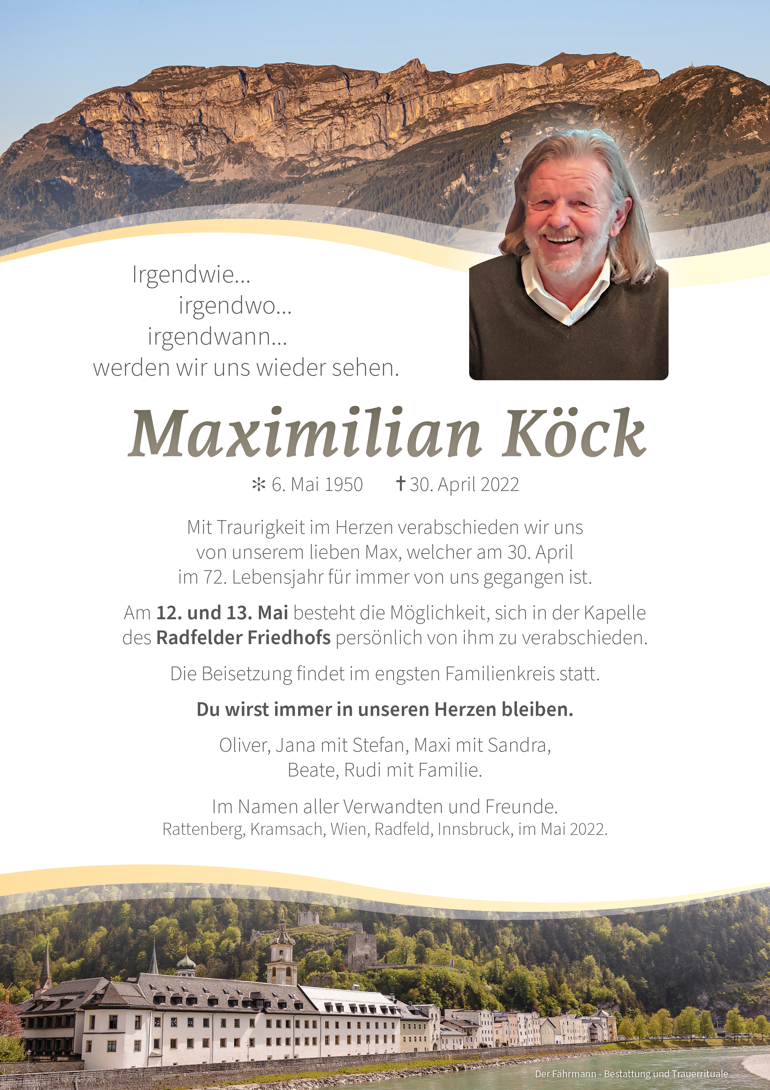 Maximilian Köck 06.05.1950 30.04.2022 Radfeld Beisetzungs-Ort: Friedhof Radfeld Aufbahrungs-Ort: Aufbahrungshalle Radfeld am 12.5. ab 10 Uhr bis 13.5. 20 Uhr Parte Gedenkkerzen Kondolenzen Parte downloaden Gedenkkerzen für Maximilian Köck 23 Einträge Kerze anzünden Fam. Alexander Henkel Gerhard Peychär Greti und Fritz Fischer Fritz Gundi und Alfred In lieber Erinnerung an unsere Theaterzeit. Rosmarie Heike, Sandro und Lucia Heike, Sandro und Lucia Heike, Sandro und Lucia Familie Peter u. Hannelore Radinger Peter & Carina Sylvia & Christoph Knoll Maria & Klausi Hari&Tina Volland Doris & Isabella Doris & Isabella Britta und Herbert Martin & Linda Inge Knapp Vanessa Nina und Tobias Liebe, Licht und Frieden Eine gute Überfahrt Bestattung DER FÄHRMANN Eine Kerze für Maximilian Köck Ihr Name* Ihre Nachricht oder Name* E-Mail-Adresse* Mit dem Klicken auf "Kerze anzünden" erklären Sie sich mit unseren Datenschutzbestimmungen einverstanden. Kondolenzbuch für Maximilian Köck 0 Einträge Kondolenz verfassen Ihr Abschiedsgruß an Maximilian Köck Ihr Name* E-Mail-Adresse* Ihre Nachricht* Mit dem Klicken auf "Gruß absenden" erklären Sie sich mit unseren Datenschutzbestimmungen einverstanden. Maximilian Köck 06.05.1950 – 30.04.2022 Parte Gedenkkerzen Kondolenzen Kerze anzünden Kondolenz verfassen