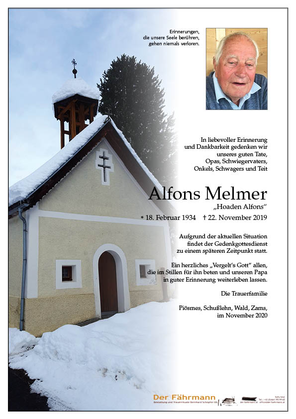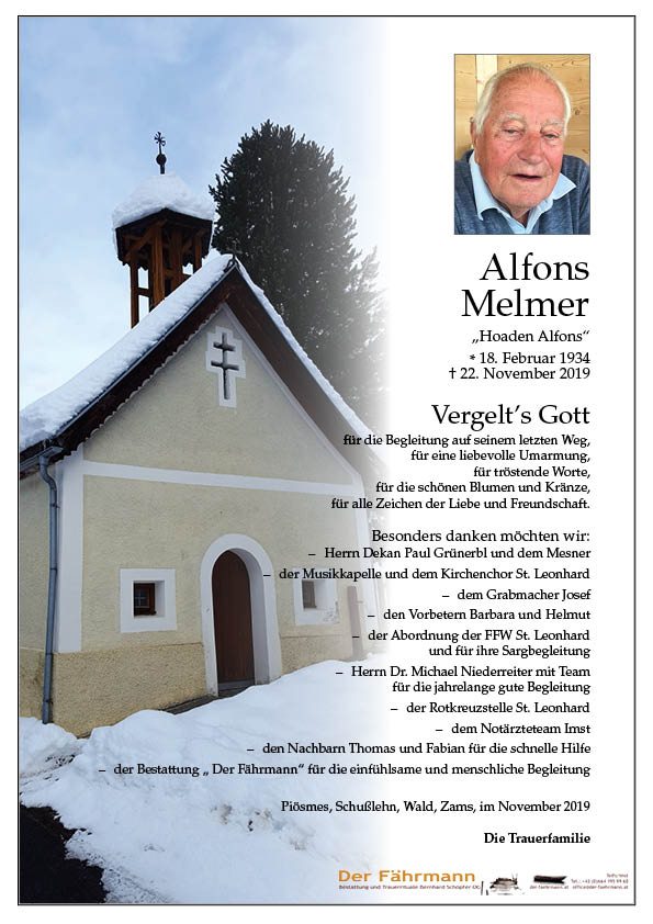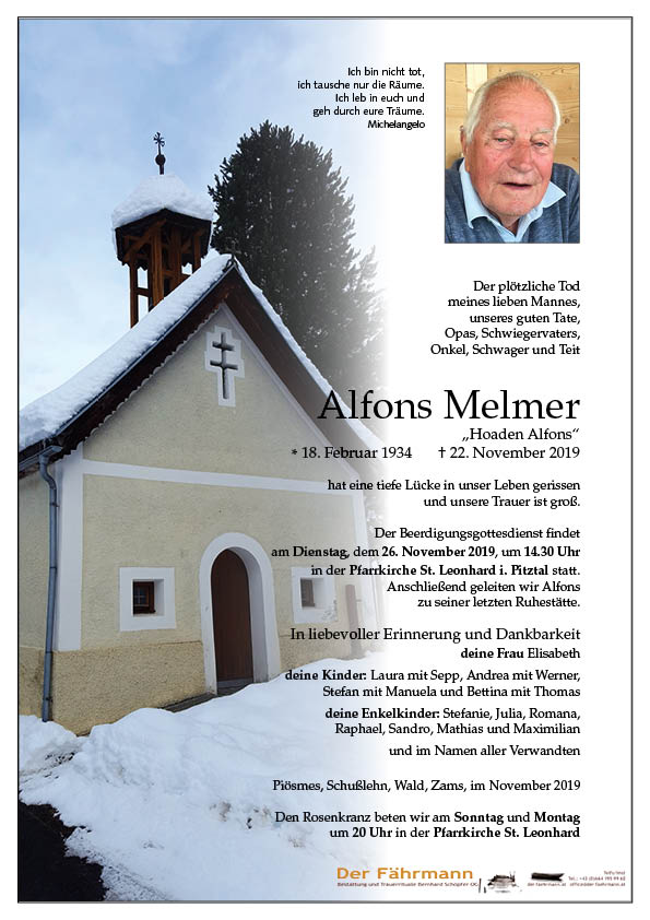 Du warst für die meisten, die Dich kannten, der „Hoadn Alfons“: Gemeindearbeiter, Lifteler, Versicherungsvertreter, ein guter Kartner und ein Mensch, der immer geholfen hat, wenn man Dich brauchte. Für uns warst du aber nicht nur der „Hoadn“, nein für uns warst Du unser geliebter Tata und Opa mit dem wir viel lachen, reden und diskutieren konnten. Nicht immer ist man mit Dir auf einen „grünen Zweig“ gekommen, trotzdem hast Du schließlich die Diskussion mit einem „wenn da muansch“ beendet und warst nie böse. Für uns hast Du alles gemacht und mit Dir konnten wir alles machen. Strenge oder gar eine Bestrafung gab es bei Dir selten.