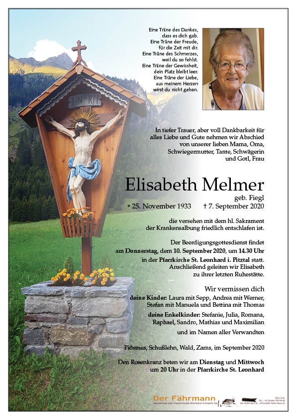 Einige Tage sind nun bereits vergangen, seit du für immer eingeschlafen bist. Dein Tod kam nicht wirklich überraschend und irgendwie doch, denn es ist nie zu spät aber immer zu früh. Wir sind sehr traurig, dass du nicht mehr da bist. Dein Tod kam in den frühen Morgenstunden, am 7. September. Deine Kinder und einige Enkelkinder saßen am Abend zuvor noch an deinem Bett und durften dich ein Stück auf deinen letzten Weg begleiten. Gemeinsam mit Schwester Lydia konntest Du noch die Krankensalbung erhalten. Wir sind froh und dankbar, dass dich deine Kinder bis zu deinem letzten Atemzug begleiten durften. Denn nun bist du frei. Frei von Schmerzen, frei von Leid.