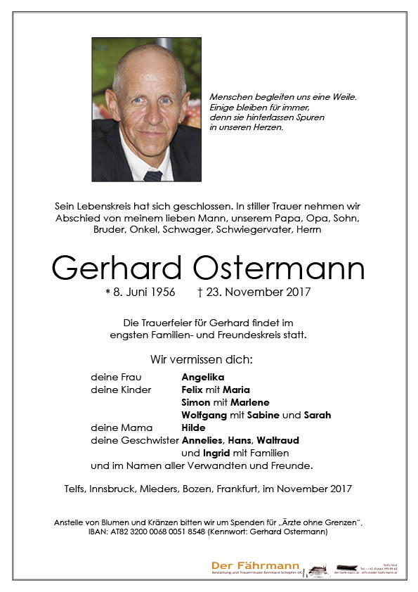 Tief betroffen sehe ich dass mein Cousin Gerhard zu seinem Vater Konrad gegangen ist. Erschütternd und doch mit liebenswerten, schönen Erinnerungen wirst du in unserer Familie deinen Platz haben.