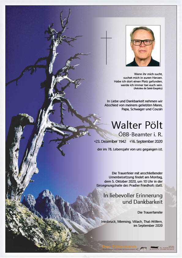 Pölt Walter 23.12.1942 16.09.2020 Innsbruck Beisetzungs-Ort: Pradler Friedhof Parte Gedenkkerzen Kondolenzen Parte downloaden Gedenkkerzen für Pölt Walter 13 Einträge Kerze anzünden In lieber Erinnerung und Dankbarkeit, Manfred und Andrea Du bist in unseren Herzen Papa, Dolores und Gregor Edelgard Moll Hugo Arbeitskollege Fam. Wimmer Innsbruck In lieber Erinnerung - Dora & Hans R. In lieber Erinnerung Fam. Wechselberger Silvia Thomas und Martin Engl du wirst uns fehlen BB-Musik Innsbruck Pölt Hans und Martina Oberhauser Hans Ruhe in Frieden Thomas u. Evelyn mit Anne, wir werden dich vermissen eine gute Überfahrt Bestattung DER FÄHRMANN Eine Kerze für Pölt Walter Ihr Name* Ihre Nachricht oder Name* E-Mail-Adresse* Mit dem Klicken auf "Kerze anzünden" erklären Sie sich mit unseren Datenschutzbestimmungen einverstanden. Kondolenzbuch für Pölt Walter 0 Einträge Kondolenz verfassen Ihr Abschiedsgruß an Pölt Walter Ihr Name* E-Mail-Adresse* Ihre Nachricht* Mit dem Klicken auf "Gruß absenden" erklären Sie sich mit unseren Datenschutzbestimmungen einverstanden. Pölt Walter 23.12.1942 – 16.09.2020 Parte Gedenkkerzen Kondolenzen Kerze anzünden Kondolenz verfassen