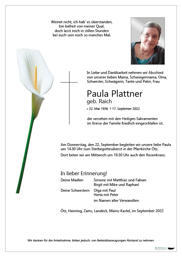 Kondolenzbuch für Paula Plattner