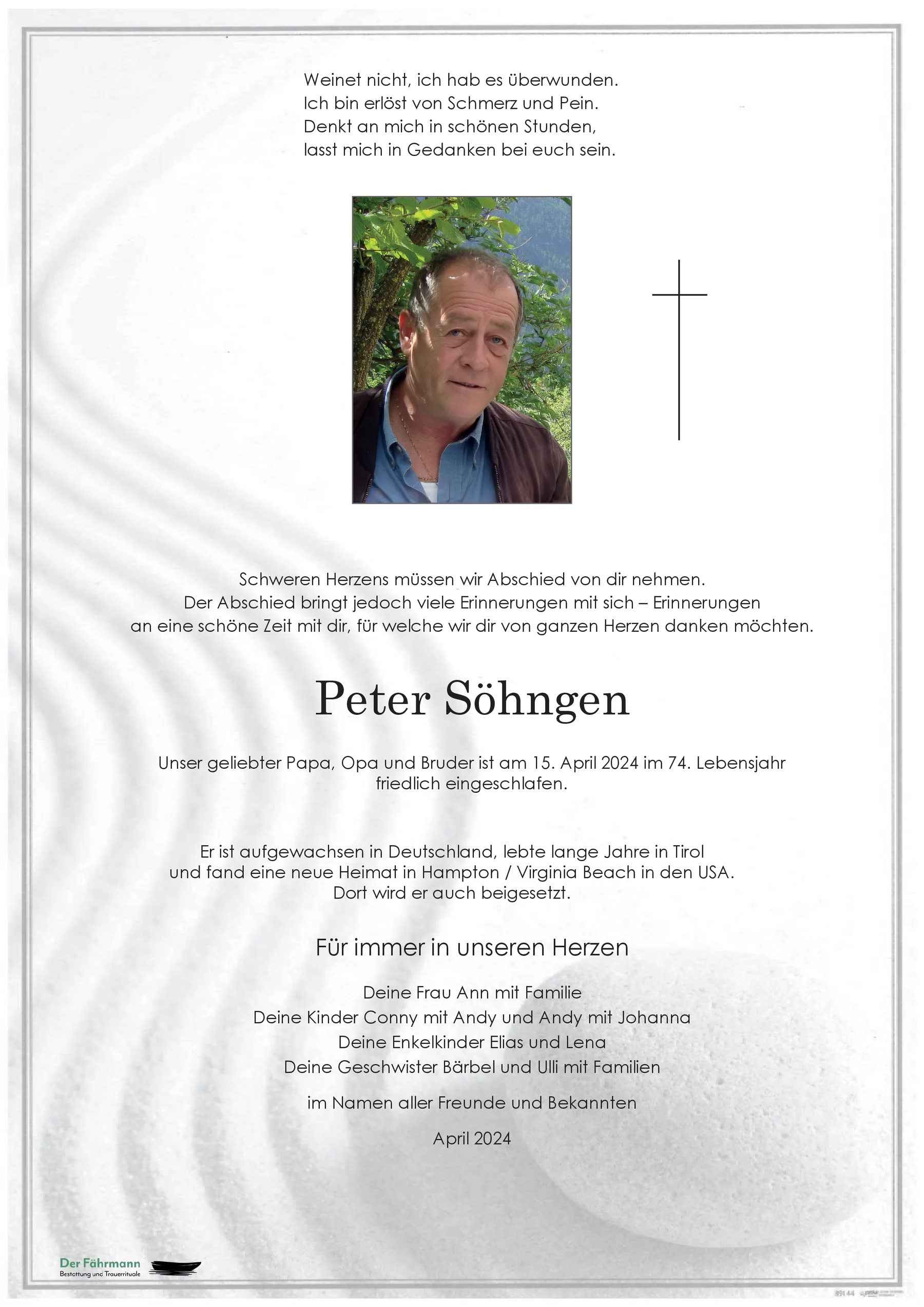 Wir wünschen euch viel Kraft und Gottvertrauen. Möge die Zeit schnell vergehen und euer Schmerz erträglicher werden damit ihr bald wieder mit einem Lachen über Peter sprechen könnt.