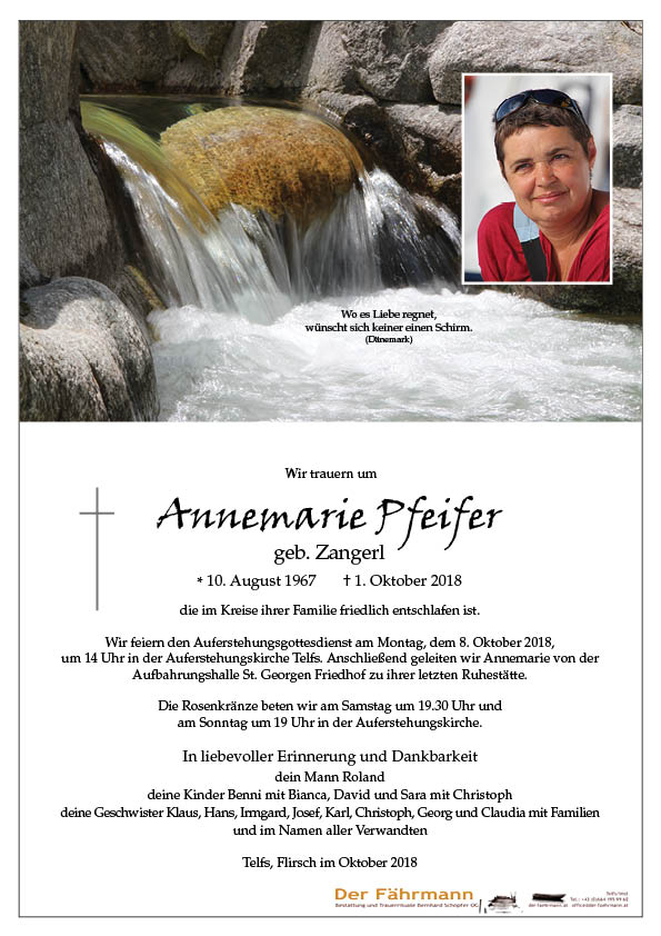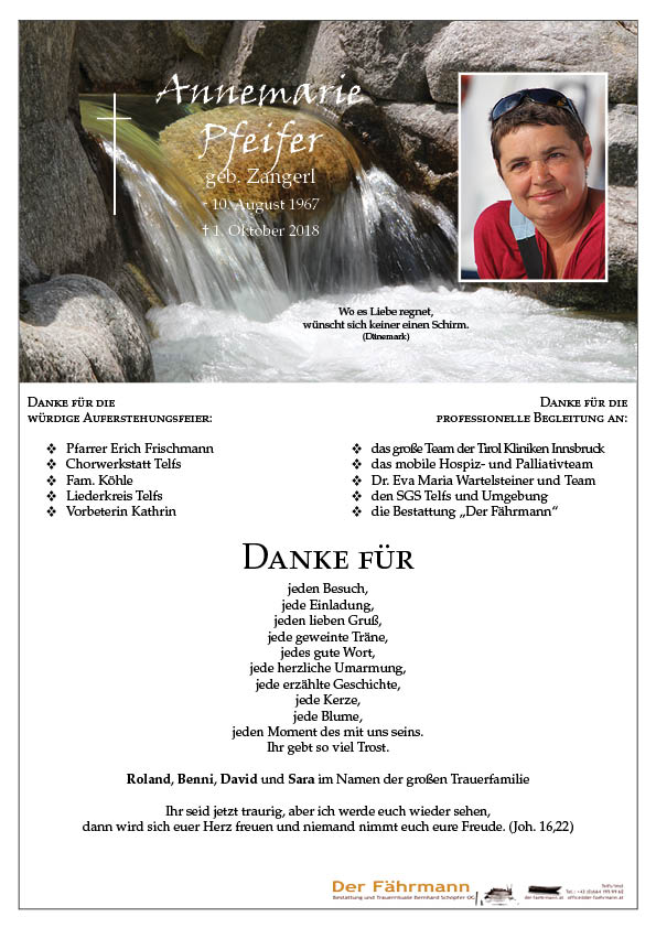 Zufällig bin ich heute in Flirsch spazieren gegangen und habe mit tiefer Trauer gesehen, dass Annemarie verstorben ist. Das tut mir unendlich Leid. Wünsche dir und deinen Kindern, sowie allen Trauernden Kraft und Zuversicht in dieser schweren Zeit. Annemarie wird mir immer n liebevoller Erinnerung bleiben.