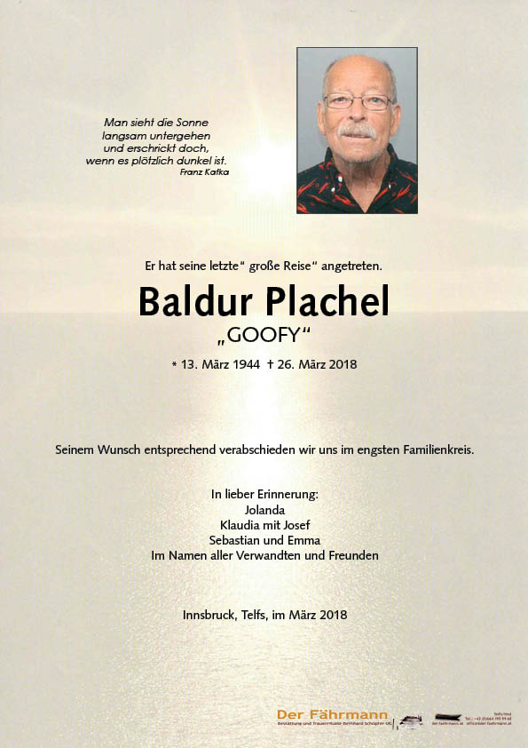 Plachel Baldur 13.03.1944 26.03.2018 Innsbruck Beisetzungs-Ort: Pradler Friedhof Parte Gedenkkerzen Kondolenzen Parte downloaden Gedenkkerzen für Plachel Baldur 29 Einträge Kerze anzünden Wolfgang Köck Ruhe in Frieden Baldur Christine Koll mit Familie In lieber Erinnerung Stani Stephan,Karin & Laura Grumser Rudi Als Freund unvergessen Grumser Günther Am Ende steht ein neuer Anfang Grumser Günther In lieber Erinnerung Roland und Gerda A Liachtl für di, Vevi u. Peter In lieber Erinnerung Reiter Heinz Ruhe in Frieden!!Messner Manni u.Andrea Ruhe in Frieden!! Silvia Jenewein Reuters Heinz hmz.reiter@gmail.com in stillem Gedenken Leopold und Veronika Alexandra & Sebastian Raphaela, René & Samuel In lieber Erinnerung Viola mit Reini Gabriela und Andrea In lieber Erinnerung dein Freund Mario mit Irmi In lieber Erinnerung Berni und Barbara Evelin und Ingo Gärtner Ruhe in Frieden Elke und Denise Gaby und Christian Klaudia, Josef, Sebastian und Emma In LIEBER Erinnerung Jolly eine gute Überfahrt Bestattung DER FÄHRMANN Eine Kerze für Plachel Baldur Ihr Name* Ihre Nachricht oder Name* E-Mail-Adresse* Mit dem Klicken auf "Kerze anzünden" erklären Sie sich mit unseren Datenschutzbestimmungen einverstanden. Kondolenzbuch für Plachel Baldur 0 Einträge Kondolenz verfassen Ihr Abschiedsgruß an Plachel Baldur Ihr Name* E-Mail-Adresse* Ihre Nachricht* Mit dem Klicken auf "Gruß absenden" erklären Sie sich mit unseren Datenschutzbestimmungen einverstanden. Plachel Baldur 13.03.1944 – 26.03.2018 Parte Gedenkkerzen Kondolenzen Kerze anzünden Kondolenz verfassen