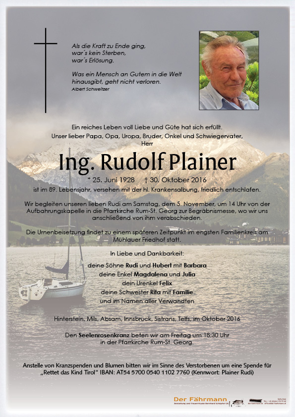 Plainer Rudolf 25.06.1928 30.10.2016 Rum Beisetzungs-Ort: Friedhof Mühlau Parte Gedenkkerzen Kondolenzen Parte downloaden Gedenkkerzen für Plainer Rudolf 14 Einträge Kerze anzünden Wolfgang Köck Fam. Toni Seissl Kufstein In lieber Erinnerung! Martina aus Neuseeland A Kerze aus der Wildschönau Ein Licht auf Reise - Christine und Sepp In dankbarer Erinnerung Wieser Klaus RUHE IN FRIEDEN Cilli Schwarzbauer lieber Papa, ruhe in Frieden, danke!!! Onkel Rudi,ruhe in Frieden. Hanni und Wolfgang Waldegger Onkel Rudi,ruhe in Frieden. hans jäger telfs In stiller Verbundenheit Andrea u. HansGeorg S. Geh ins Licht... Maria eine gute Überfahrt „Bestattung DER FÄHRMANN“ Eine Kerze für Plainer Rudolf Ihr Name* Ihre Nachricht oder Name* E-Mail-Adresse* Mit dem Klicken auf "Kerze anzünden" erklären Sie sich mit unseren Datenschutzbestimmungen einverstanden. Kondolenzbuch für Plainer Rudolf 0 Einträge Kondolenz verfassen Ihr Abschiedsgruß an Plainer Rudolf Ihr Name* E-Mail-Adresse* Ihre Nachricht* Mit dem Klicken auf "Gruß absenden" erklären Sie sich mit unseren Datenschutzbestimmungen einverstanden. Plainer Rudolf 25.06.1928 – 30.10.2016 Parte Gedenkkerzen Kondolenzen Kerze anzünden Kondolenz verfassen