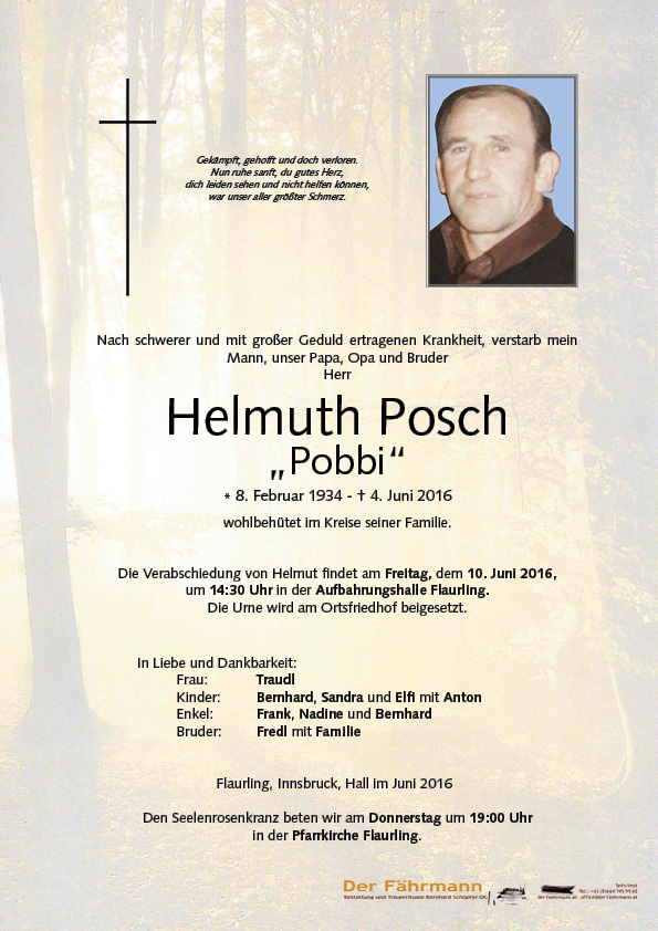 Posch Helmuth 08.02.1934 04.06.2016 Flaurling Beisetzungs-Ort: Friedhof Flaurling Parte Gedenkkerzen Kondolenzen Parte downloaden Gedenkkerzen für Posch Helmuth 9 Einträge Kerze anzünden Ruhe in Frieden Ruhe in Frieden Wolfgang Köck Fam. Grill Klaus Alfred Posch Ruhe in Frieden! Ruhe in Frieden! hans jäger telfs Ruhe in Frieden Eine Kerze für Posch Helmuth Ihr Name* Ihre Nachricht oder Name* E-Mail-Adresse* Mit dem Klicken auf "Kerze anzünden" erklären Sie sich mit unseren Datenschutzbestimmungen einverstanden. Kondolenzbuch für Posch Helmuth 0 Einträge Kondolenz verfassen Ihr Abschiedsgruß an Posch Helmuth Ihr Name* E-Mail-Adresse* Ihre Nachricht* Mit dem Klicken auf "Gruß absenden" erklären Sie sich mit unseren Datenschutzbestimmungen einverstanden. Posch Helmuth 08.02.1934 – 04.06.2016 Parte Gedenkkerzen Kondolenzen Kerze anzünden Kondolenz verfassen