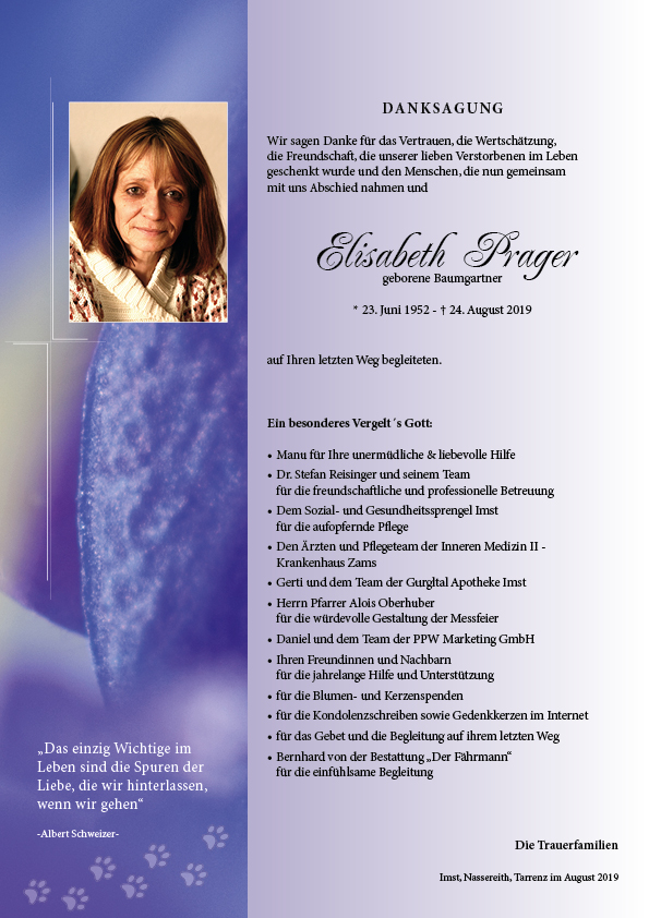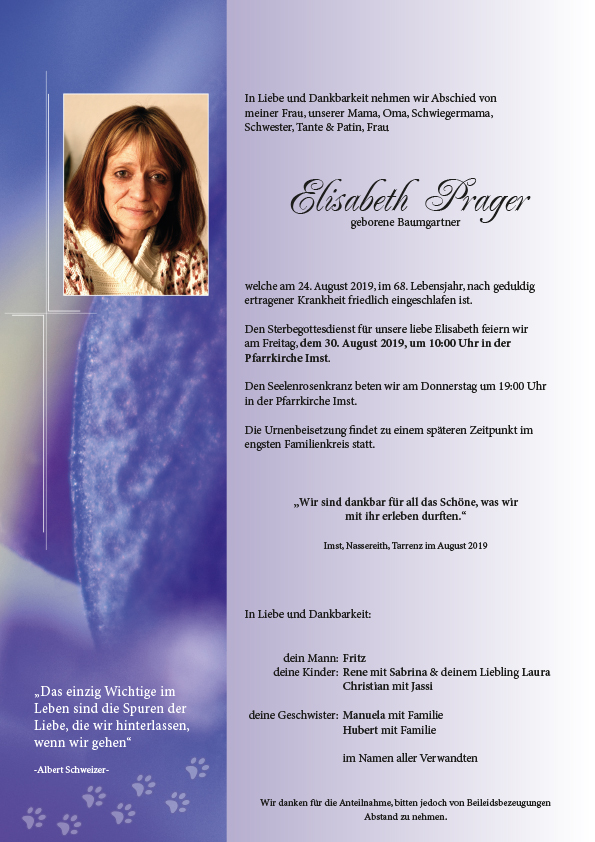 Mein Beileid zu eurem großen Verlust. Elisabeth war ein wundervoller Mensch und ich danke für die Begegnung und schönen Gespräche mit ihr, die ich stets in Erinnerung behalte.