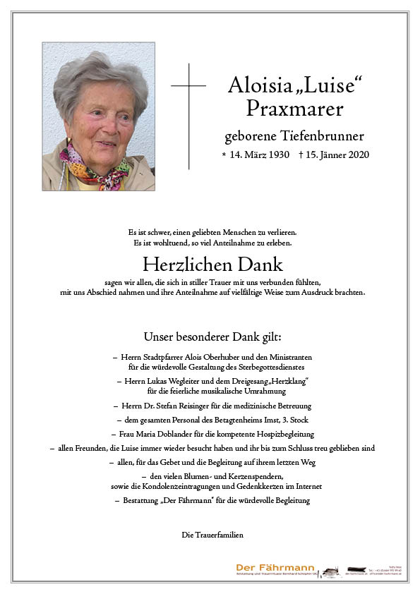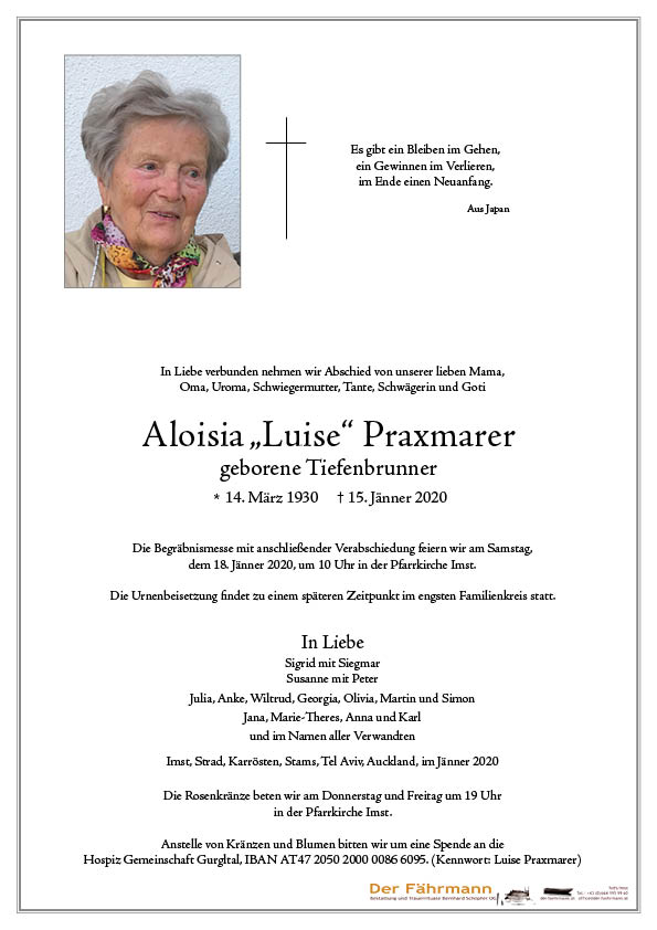 Liebe Angehörige. Ich bin ganz erschüttert denn wir haben so viele schöne Stunden mit Luise und früher mit Hans verbracht. Wir haben im Haus Praxmarer unsere Hochzeit gefeiert. Luise hat mir das Kochen gelernt Kaiserschmarrn und Speckknödel und weil es nicht mehr möglich war das meine Eltern Sie besuchten treffen sie sich jetzt im Himmel. In großer Anteilnahme mit vielen schönen Erinnerungen Verena Prochnow geb. Antlauf und Detlef Prochnow