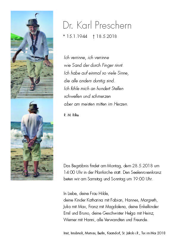 Dr. Preschern-Charly- den ich beim Bundesheer 1966 kennenlernte der mit mir das Medizinstudium absolvierte, ist ein lebenslang treuer Freund geblieben. Um so größer ist meine-unsere- Trauer über den Verlust dieses positiv Strahler. Würden wir Menschen uns seiner Empathie nur teilweise bemächtigen, so würden auf dieser Erde weniger Tränen vergossen! Lb Freund ich werde Dich immer in positiver Erinnerung bewahren.