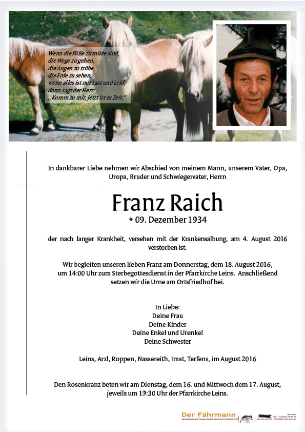 Raich Franz 09.12.1934 04.08.2016 Leins Beisetzungs-Ort: Friedhof Leins Parte Gedenkkerzen Kondolenzen Parte downloaden Gedenkkerzen für Raich Franz 140 Einträge Kerze anzünden Wolfgang Köck Ruhe in Frieden! Evi In Lieber Erinnerung Ruhe in Frieden ! Evi Schuler Ruhe in Frieden ! Evi Schuler Ruhe in Frieden! Ruhe in Frieden! Heinz & Andrea Neuner Fam. Caroline u. Mathias Baumann Familie Venier Klaus Schönwies Paul und Annemarie Fam. Krajic Harald & Conny Fam.Reindl "Pfundser" sabrina In lieber Erinnerung Siggi und Sonja Nadine Sandra und Wolfgang mit Lea und Mia Fam.Lechner Ernst Fam. Flür Georg u. Alexandra Fam. Andreas Huter, Leins Fam. Stefan Haßlwanter Fam.Gerhard Wechselberger Ruhe in Frieden! Evi Wolfgang und Christine mit Familie Günter und Claudia Schuler Ruhe in Frieden! Mario mit Daniela, Felix u. Antonia Stocker Herbert und Anita mit Familie Patricia und Bernd mit Ida Patricia und Bernd mit Ida Sieglinde mit Familie Schatz Elke Ulli und Geli Familie Donnemüller Fam. Reinhard Stocker Rosemarie Thurner Imst Rosemarie Thurner Renate Gastl Landeck Hannelore und Pepi Wald Arthur und Irmgard Gastl Fam. Raimund&Claudia Pfefferle Judith & Gerhard Heim Via Claudia, Nassereith Ruhe in Frieden Michaela Raich Ruhe in Frieden Opa deine Enkelin Madelein Angelika m. Fam Familie Albert und Erika Raggl Ruhe in Frieden Roman und Annemarie Raggl Fam. Schnegg Christine (Neuner) ein Licht für die Reise vom Haflinger Zuchtverband Tirol A Liachtle für deine Reise von Michi Burkhard und Martina mit Lisa Ruhe in Frieden Ruhe in Frieden Sandra Fam.Schlatter u.Rimml Ruhe in Frieden! Nicole Fam. Rudolf und Margit Larcher Ruhe in Frieden! Das Pflegezentrum Pitztal Team Fam. Stefan & Martina Holzer Ernst und Renate Oppl Kilian u.Patricia mit Stefanie Selma u. Jasmine Ruhe in Frieden Lore u.Josef Fam. Gundolf Maria Kienel Patricia Magdalena und Gotthard Pfiati Vetter Ruhe in Frieden Pfiati VEltern Ruhe in Frieden Ruhe in Frieden. Lydia Martin Sandro Damian Ruhe in Frieden Hedwig mit Familie Matthias u. Klaudia Rauch mit Fam. Ruhe in Frieden Edith u. Franz Christl Raich Seppl Hafele Manuel Ruhe in Frieden . Rosmarie & Dietmar 🙏❤️ Team der Chirurgie 2 Machs Guat Opa Simone Martin und Mario Barbara Bair Wenns Ruhe in Frieden Sonja Ruhe in Frieden Martha Köll Ruhe in Frieden Bianca ,Bernhard ,Patrick ,Melissa ,Marco Mark Erwin Lizi mit Familie Ruhe in Frieden Irma Neururer Fam.Herbert und Ingrid Gastl Roland u. Petra Holzknecht Fam. Othmar & Elke Fürstauer Maria & Roswitha Santer Wenns Marlies & Hermann Reinstadler Fam.Berni & Rosa Larcher hans und annemarie jäger telfs Sabrina und Fabian mit Sofia Ruhe in Frieden Hannes & Bettina Ruhe in Frieden Fam.olga &Hansi Leitner Armin und Nicole Raich Maria &Norbert Reheis Ruhe in Frieden. Martina und Dominik Michael und Melanie mit Tobias Fam. Alexandra Struc Fam. Banyai Machs guat Kathrin Marco & Christina Ruhe in Frieden . Rosmarie & Dietmar 🙏❤️ Karin, Harald, Jeanine u. Fabian Ruhe in Frieden Opa ich werde dich nie vergessen 🙏❤️ Opa wir werden dich nie vergessen. ♡ Fam. Stapelfeldt Beate mit Peppi . Ruhe in frieden. Beate mit Peppi . Ruhe in frieden. Beate mit . Ruhe in frieden. Fam.Peter & Conny Abrahams Jaqueline & Arno mit Emma Nadine mit Florian Paul u.Annemarie hans jäger telfs Fam. Ulrike und Kurt Röck Johann Agnes und Elija Pepi u. Erika Eisenbeutl Yvonne & Daniel Cornelia & Werner Birgit und Manfred Klaus mit Belinda, Verena und Sarah Familie Gebauer Familie Peter Köll Fam. Birgit und Klaus Zimmermann Schuler Jürgen & Simone Angela Hotz Families Edwin Gastl Fam.Pohl Heike und andi Ruhe in Frieden Traudl und Karl Team d.Pitztal & Laurentiusapotheke Siggi mit Fam. Ruhe in Frieden Pfiati Vötter-Herbert und Lisa Michael und Erika Fam. Neururer Hohenegg Anna & Alfred Neurauter Hannelore mit Familie Ruhe in Frieden Fam. Götsch Walter Fam.Lechner Walter Waibl Raphael Arzl Ruhe in Frieden Barbara und Helmut Eine Kerze für Raich Franz Ihr Name* Ihre Nachricht oder Name* E-Mail-Adresse* Mit dem Klicken auf "Kerze anzünden" erklären Sie sich mit unseren Datenschutzbestimmungen einverstanden. Kondolenzbuch für Raich Franz 0 Einträge Kondolenz verfassen Ihr Abschiedsgruß an Raich Franz Ihr Name* E-Mail-Adresse* Ihre Nachricht* Mit dem Klicken auf "Gruß absenden" erklären Sie sich mit unseren Datenschutzbestimmungen einverstanden. Raich Franz 09.12.1934 – 04.08.2016 Parte Gedenkkerzen Kondolenzen Kerze anzünden Kondolenz verfassen