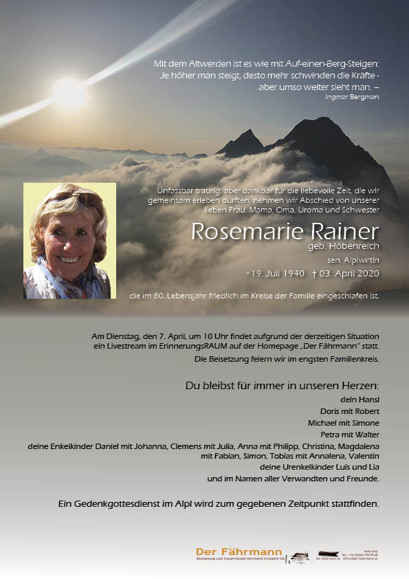 In der Hoffnung, im Sommer gemeinsam auf der Alpl-Hütte eine Gedenkmesse an Rosemarie feiern zu können, verbleiben wir in inniger Verbundenheit