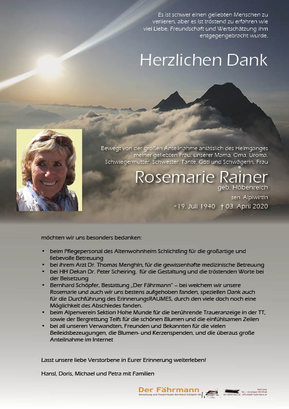 Liebe Trauerfamilie, auch für uns von der Bergrettung in Mieming war es sehr traurig zu hören, dass uns Rosmarie voraus gegangen ist. Wir möchten euch unser tief empfundenes Beileid ausdrücken. Rosmarie wird für immer mit vielen schönen Erinnerungen verbunden sein. Wir wünschen euch viel Kraft in dieser schweren Zeit. Für die Kameraden der BR Mieming - Clemens Krabacher