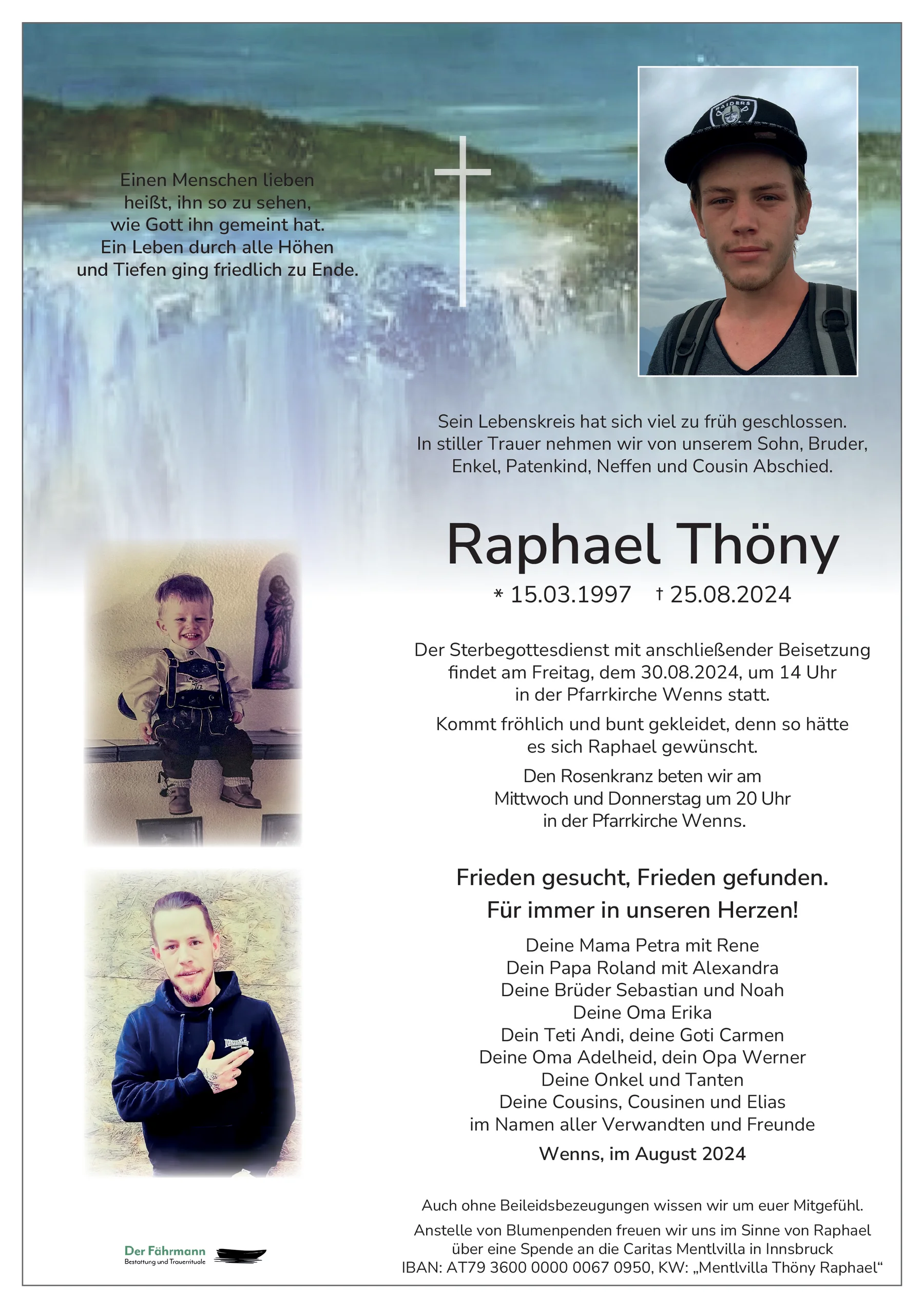 Liebe Petra mit Familie, liebe Oma Erika. Die Nachricht von Raffaels Ableben hat uns alle sehr getroffen und wir sprechen Euch unser tiefes Beileid aus. Euer