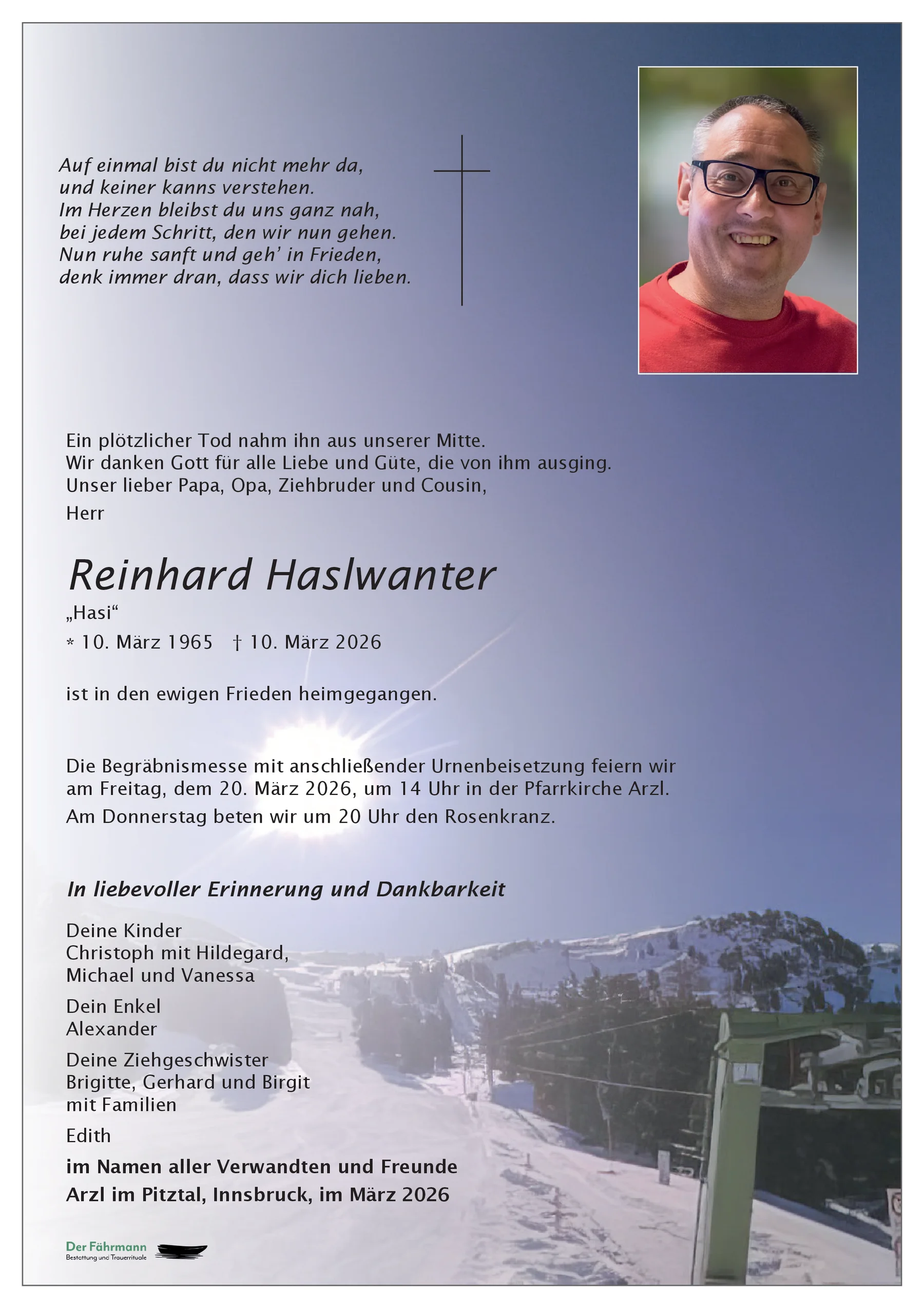 Lieber Reinhard, auch wir die gesamte Belegschaft der Hochzeiger Bergbahnen sind sehr traurig anlässlich deines plötzlichen Ablebens.