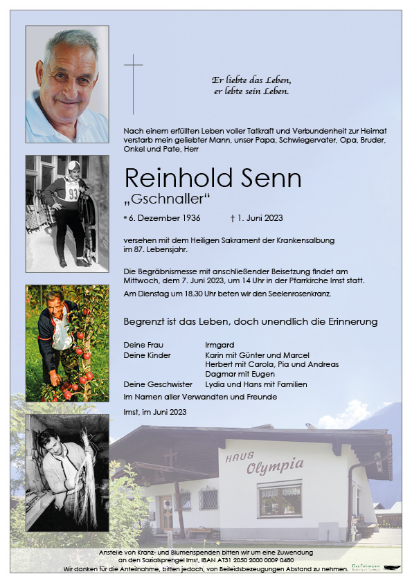 Ein bärenstarker Mensch warst du, Spitzensportler, tatkräftig und fleißig, manchmal rau und doch verletzlich, hilfsbereit und großzügig. Dein schelmisches, gewinnendes Lächeln wird mir immer in Erinnerung bleiben. Ruhe in Frieden lieber Reinhold