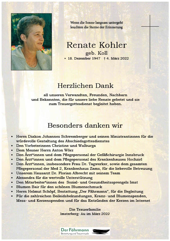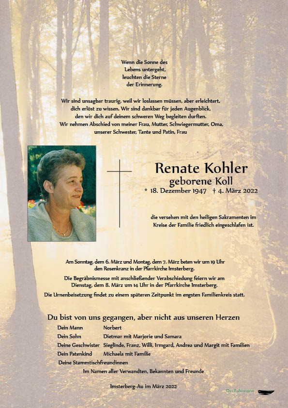 Wir wünschen euch viel Kraft und Gottvertrauen. Möge die Zeit schnell vergehen und euer Schmerz erträglicher werden damit ihr bald wieder mit einem Lachen über Renate sprechen könnt.