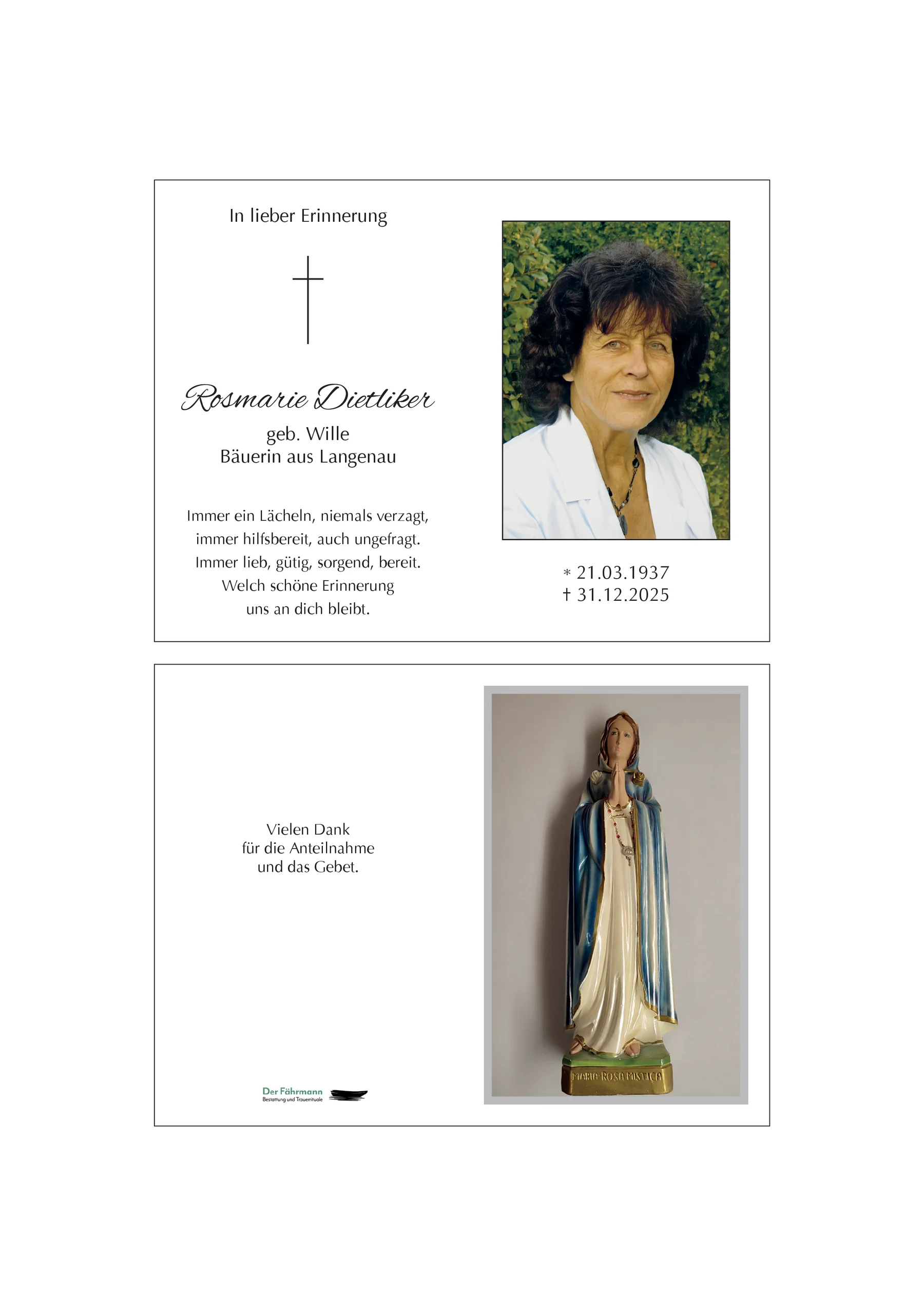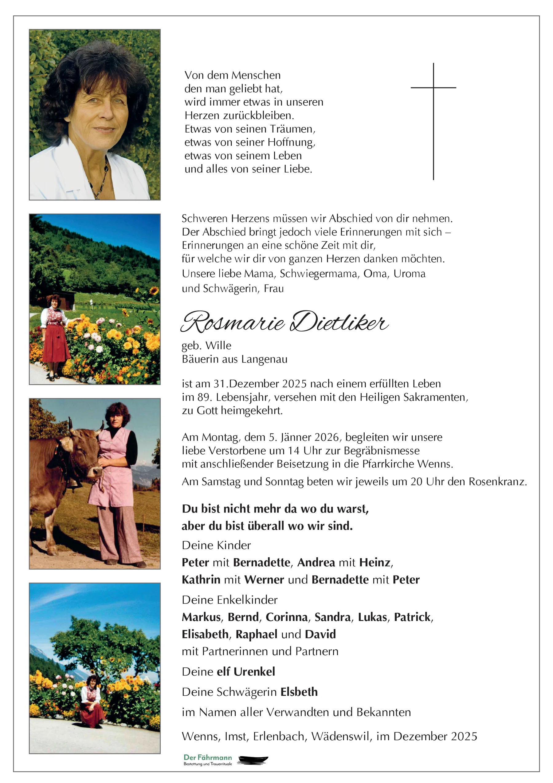 Lieabe Rosmarie hob heint Tränen in denn Augen weil ih gesehen hob das du nimma unter ins bisch des wos mir über di als erster eingefallen isch das du einer meiner Lieblingsfrauen worsch immer guat drauf immer ah Wort für mi wenn ih di getroffen hob du hosch an guata Humor kett u worsch immer Lustig u guat drauf woasch no wiea ih in Wenns gewohnt hob u du mit zwoa volle einkaufstaschen Huam bisch zu Fuß ih hob damals der Tanja gerade an Motorroller gekauft u ih hob gesagt zu dir ih Fohr die Huam Rosmarie ih hat mir decht niea Denkt das du bei mir aufschteigsch ober do hob ih mi getäuscht du bisch aufgestiegen u mir sein zu dir Huam auf Langenau ih woas no guat diea Steigung mit ins zwoa am Roller hot der nit ganz derpockt ober mit ah bissele onschupfen hobes mir dann doch geschafft Rosmarie mir sehen uns wieder ganz bestimmt u der Herrgott hot sicher an Roller oben den er ins Leicht nocha fohra mir ah Runde lei mir Zwei bis dahin bisch in meinem Herz Andreas