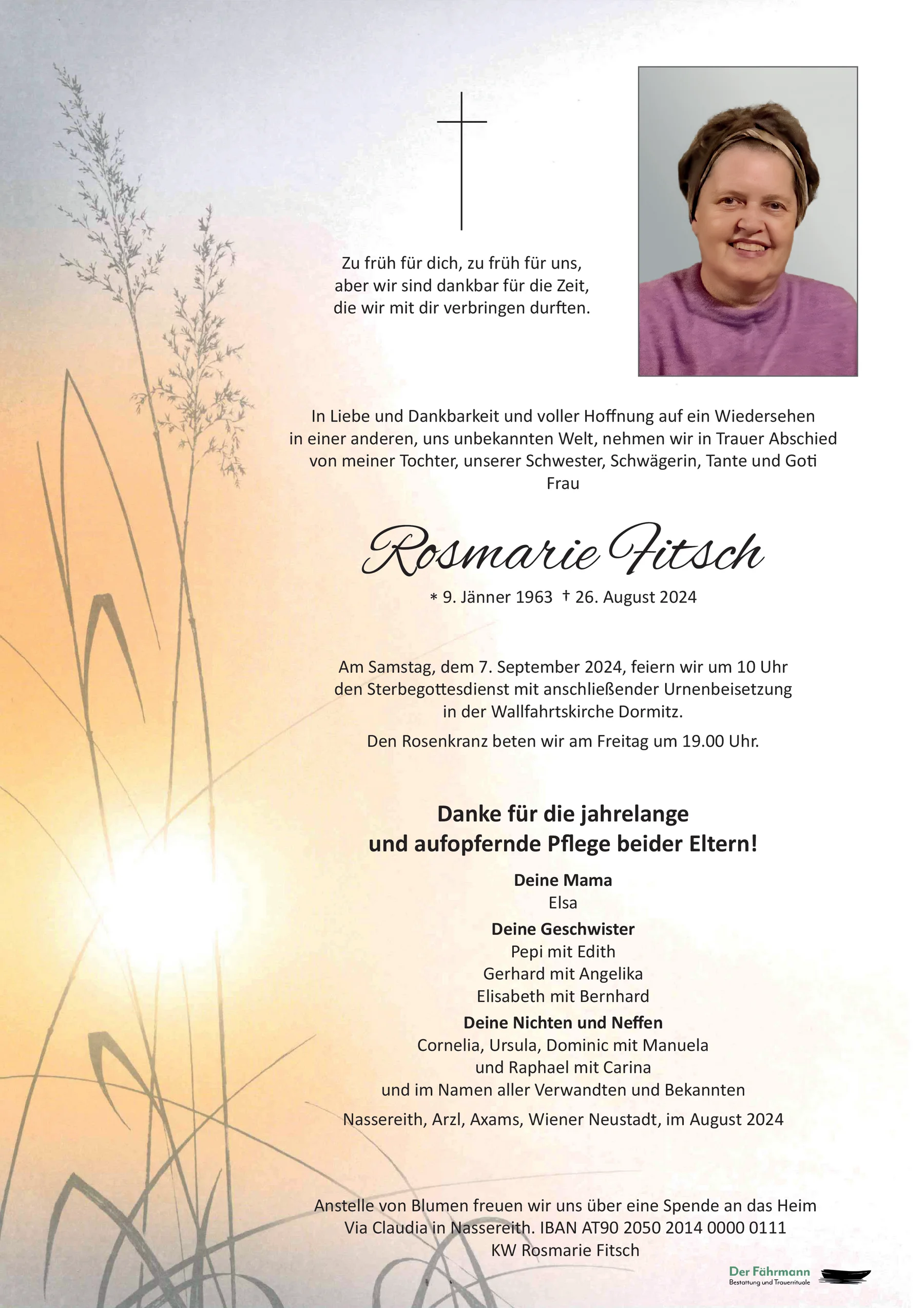 Mein aufrichtiges Beileid zum Verlust Eurer lieben Schwester Rosmarie!