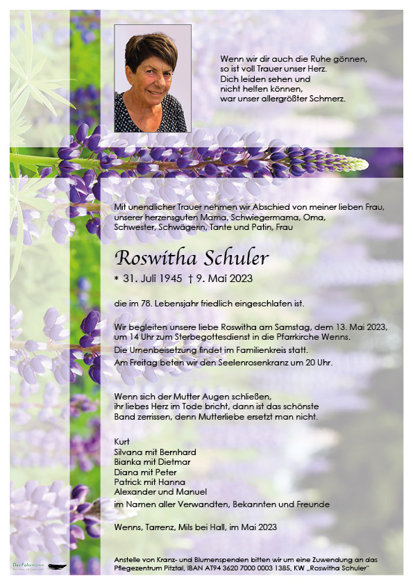 Mein herzliches Beileid zum Tod eurer lieben Roswitha! Ich wünsche euch ganz viel Kraft für diese schwere Zeit.