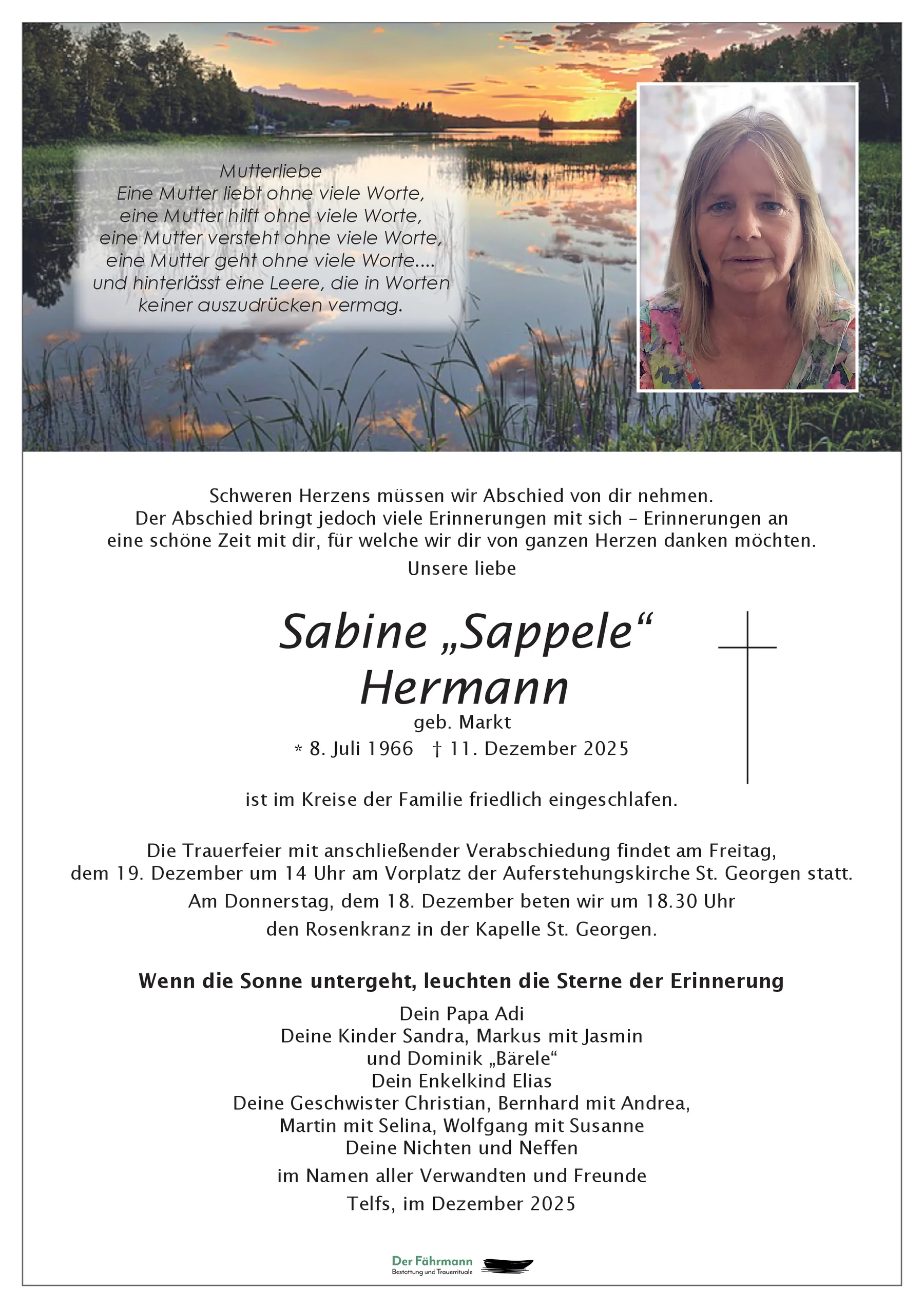 Hi Schwester,woasch mei Kopf isch seit Gestern lar.Meine Traurigkeit und Tränen sind kaum zu übersehen.Woasch Sabine nun bist Du auch Schmerzfrei,Schau auf deine Kinder und Enkel runter.aber lass Dir nichts von der E.ik. einreden.Meine Kinder -Alex mit Fam.-Thomas -Stefan und Ich hoffen das Du das Licht am Ende des Tunnels erreicht hast.Wir wünschen Dir eine schöne Reise. und pass gut auf Dich auf. Wir haben Dich Lieb Cu und XD Lili u. kindern