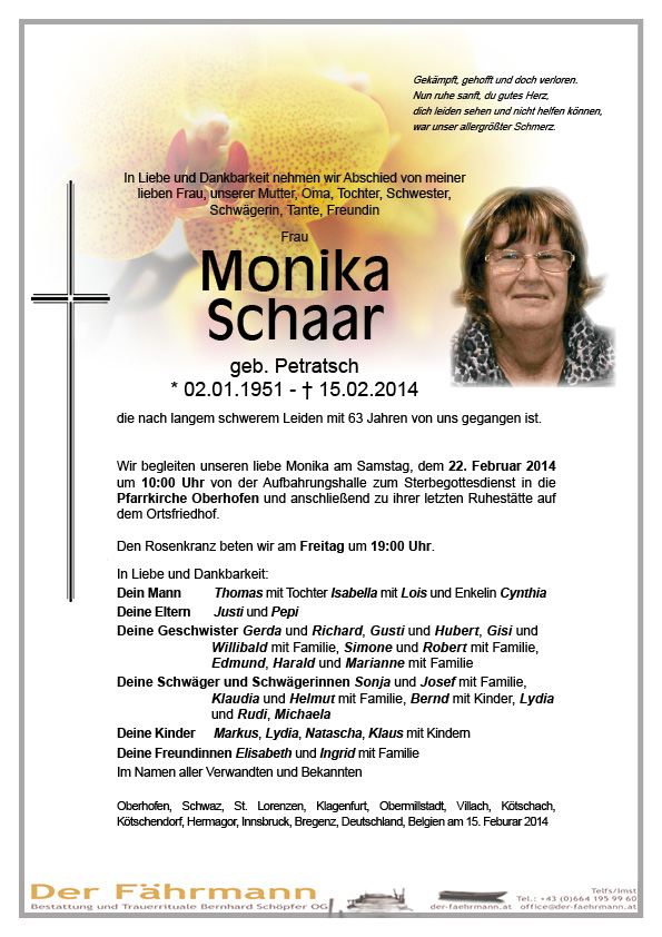 Schaar Monika 02.01.1951 15.02.2014 Oberhofen Beisetzungs-Ort: Beisetzungsort Parte Gedenkkerzen Kondolenzen Parte downloaden Gedenkkerzen für Schaar Monika 0 Einträge Kerze anzünden Eine Kerze für Schaar Monika Ihr Name* Ihre Nachricht oder Name* E-Mail-Adresse* Mit dem Klicken auf "Kerze anzünden" erklären Sie sich mit unseren Datenschutzbestimmungen einverstanden. Kondolenzbuch für Schaar Monika 0 Einträge Kondolenz verfassen Ihr Abschiedsgruß an Schaar Monika Ihr Name* E-Mail-Adresse* Ihre Nachricht* Mit dem Klicken auf "Gruß absenden" erklären Sie sich mit unseren Datenschutzbestimmungen einverstanden. Schaar Monika 02.01.1951 – 15.02.2014 Parte Gedenkkerzen Kondolenzen Kerze anzünden Kondolenz verfassen