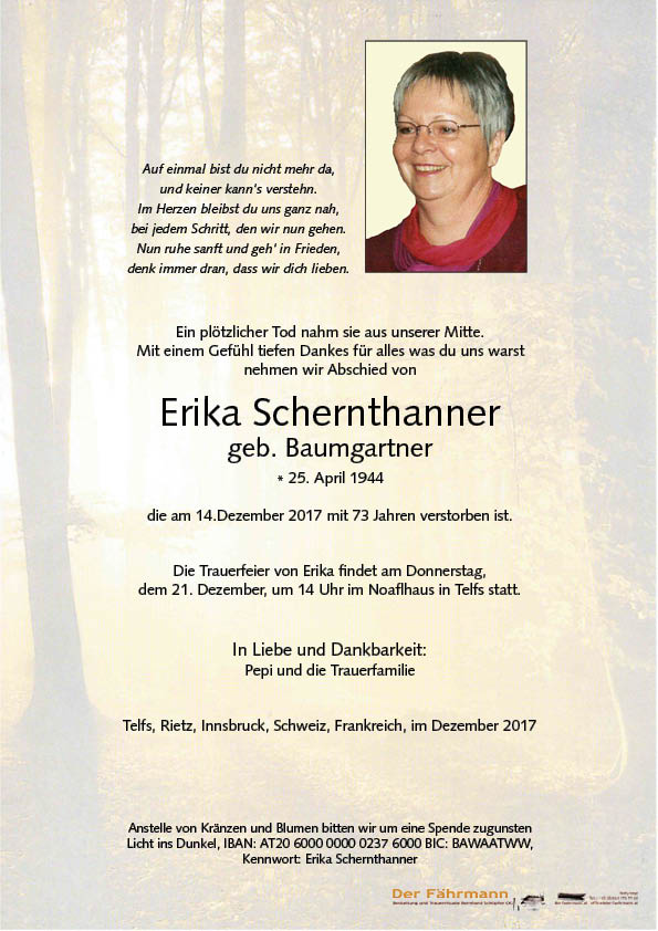 Schernthanner Erika 25.04.1944 14.12.2017 Telfs Beisetzungs-Ort: Pradler Friedhof Parte Gedenkkerzen Kondolenzen Parte downloaden Gedenkkerzen für Schernthanner Erika 21 Einträge Kerze anzünden Wolfgang Köck In lieber Erinnerung Erika und Margit vom Flohmarkt Unvergessen Ein Licht aus Leutasch Ein Licht aus Leutasch In Liebe von der Bahnhofstrasse Telfs , Malu aus deiner geliebten Leutasch Gudrun Pfiati Erika Gudrun mit Familie Ich trage dich in meinem Herzen, für immer. Karen Aufrichtige Anteilnahme Christl u. Josef Köll Ein lichtlein für dich In Liebe dagmar Es Liechtli us Lyss Ruhe in Frieden! R.I.P. Elisabeth Stroj m. Fam Aufrichtige Anteilnahme, Rappold Christine Familie Haas, Telfs u. Mieming Eurospar Inntalcenter Telfs A liachtl für di Gabi Ausserlechner mit Familie eine gute Überfahrt Bestattung DER FÄHRMANN Eine Kerze für Schernthanner Erika Ihr Name* Ihre Nachricht oder Name* E-Mail-Adresse* Mit dem Klicken auf "Kerze anzünden" erklären Sie sich mit unseren Datenschutzbestimmungen einverstanden. Kondolenzbuch für Schernthanner Erika 0 Einträge Kondolenz verfassen Ihr Abschiedsgruß an Schernthanner Erika Ihr Name* E-Mail-Adresse* Ihre Nachricht* Mit dem Klicken auf "Gruß absenden" erklären Sie sich mit unseren Datenschutzbestimmungen einverstanden. Schernthanner Erika 25.04.1944 – 14.12.2017 Parte Gedenkkerzen Kondolenzen Kerze anzünden Kondolenz verfassen