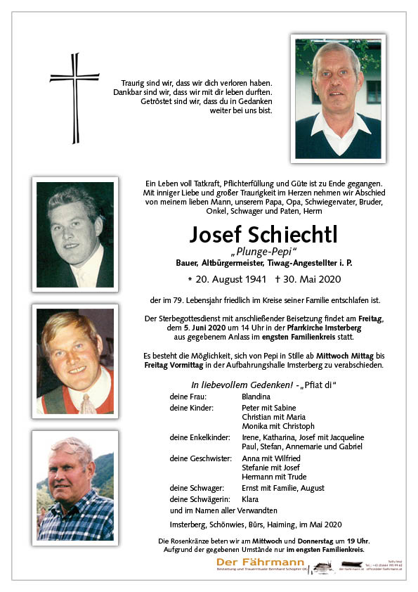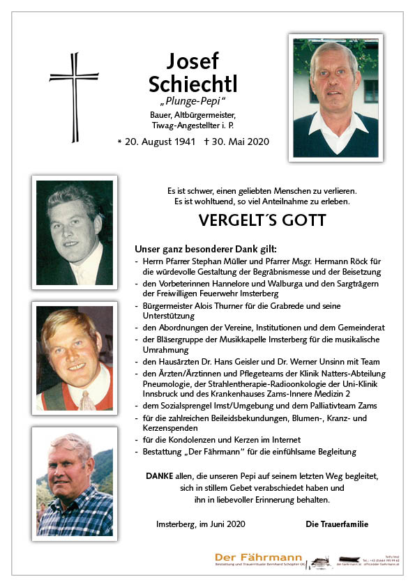 Das Schönste, was ein Mensch hinterlassen kann, ist ein Lächeln im Gesicht derjenigen, die an ihn denken. Lieber Pepi, wir waren in guter Freundschaft und Kollegialität verbunden. Gerne denke ich zurück, besonders an das Jahr 1980! Du bist uns als mein Jahrgänger dorthin vorausgegangen, wohin wir alle längst auch unterwegs sind. Möge Dir der Herrgott Dein Wirken vergelten und Deine Angehörigen trösten in dieser schweren Zeit des vorübergehenden Abschieds.