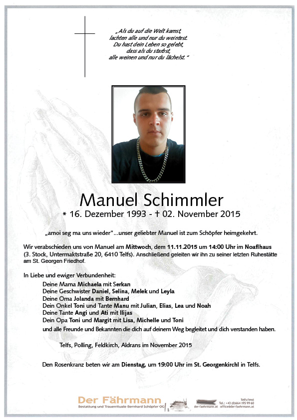 Schimmler Manuel 16.12.1993 02.11.2015 Telfs Beisetzungs-Ort: Friedhof St. Georgen Telfs Parte Gedenkkerzen Kondolenzen Parte downloaden Gedenkkerzen für Schimmler Manuel 64 Einträge Kerze anzünden Denken oft an dich! Hast immer einen Platz in unseren Herzen Ruhe in Frieden Ruhe in Frieden Wolfgang Köck Fast 4 Jahre ist es her aber ich denke immer noch an dich Ruhe in Frieden In Ewiger Erinnerung deine 1 Liebe Jaqueline :( a Liachtli aus See Fam.Tragler Jürgen Fam.Erich Mantl Im Gedanken drücke ich dich...dein Tantchen Ruhe in Frieden Familie Prandstätter, Polling Marion mit Familie, Zöblen Marina und Vera Ruhe in Frieden! In stillen gedenken.... Fam.Sprenger Polling Frieden! LehrerInnen und SchülerInnen der NMS Inzing Ruhe in Frieden Manuela Scheiring pfiati ruhe in Frieden Gute Reise Bettina u. Hansjörg Wir lassen nur die Hand los, nicht den Menschen. FamSchweigl Ruhe in Frieden Manuel ..Fam.Stöpp und Geiler Ruhe in Frieden :'( Gabriela F. Michaela P. Ruhe in Frieden Matthias Z. Werd dich nie vergessn.! :-* Ruhe in Frieden Helmut, Inge, Helli, Andi und Viky du warst und bleibst mein seelenverwandter. ich liebe dich ♡ Nadine Zoller mit Famili...r.i.p. R.i.P manu Angelika und Florian Wille Ruhe in Frieden Fam. Riezler - Polling das licht für dich mein kumpl in liebe jessy manuel ruhe in frieden du bist und bleibst in unseren herzen a Liachtle aus Imst Ruhe in Frieden Michi Viel Kraft! Isabella In stillen Gedenken...Fam. Schmarl, Polling In stillen Gedenken...Fam. Eder,Polling a Liachtli aus See Ruhe in Frieden Fam. Haider - Polling Daliah mit Familie Tamara Asslaber Ruhe in Frieden eine Geschwister liebe endet nie in Liebe selina Die Zeit war zu kurz...hdgvl...dein Tantchen in Liebe deine Oma eine mitfühlende Mama Tante Kathi und Egon. Wir fühlen mit Euch. TRAURIG Eine mitfühlende Mutter Ruhe in Frieden Simone mit Familie 4G NMS Weissenbach und Frau Großlercher Mein über alles geliebter Sohn😢 Ruhe in Frieden! Eine Kerze für Schimmler Manuel Ihr Name* Ihre Nachricht oder Name* E-Mail-Adresse* Mit dem Klicken auf "Kerze anzünden" erklären Sie sich mit unseren Datenschutzbestimmungen einverstanden. Kondolenzbuch für Schimmler Manuel 1 Eintrag Kondolenz verfassen Als Gott sah, der weg wurde zu lang....Machs gut Junge! Weggefährte 13.12.2015 | 18:29 Uhr Ihr Abschiedsgruß an Schimmler Manuel Ihr Name* E-Mail-Adresse* Ihre Nachricht* Mit dem Klicken auf "Gruß absenden" erklären Sie sich mit unseren Datenschutzbestimmungen einverstanden. Schimmler Manuel 16.12.1993 – 02.11.2015 Parte Gedenkkerzen Kondolenzen Kerze anzünden Kondolenz verfassen