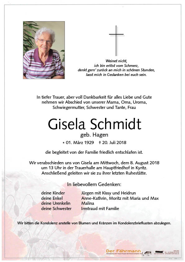 Schmidt Gisela 01.03.1929 20.07.2018 Kyritz Beisetzungs-Ort: Hauptfriedhof Kyritz Parte Gedenkkerzen Kondolenzen Parte downloaden Gedenkkerzen für Schmidt Gisela 8 Einträge Kerze anzünden Ruhe in Frieden Ruhe in Frieden Ruhe in Frieden Eine gute Reise! Judith Stockmädchen Maria RUHE IN FRIEDEN Wolfgang Köck eine gute Überfahrt Bestattung DER FÄHRMANN Eine Kerze für Schmidt Gisela Ihr Name* Ihre Nachricht oder Name* E-Mail-Adresse* Mit dem Klicken auf "Kerze anzünden" erklären Sie sich mit unseren Datenschutzbestimmungen einverstanden. Kondolenzbuch für Schmidt Gisela 0 Einträge Kondolenz verfassen Ihr Abschiedsgruß an Schmidt Gisela Ihr Name* E-Mail-Adresse* Ihre Nachricht* Mit dem Klicken auf "Gruß absenden" erklären Sie sich mit unseren Datenschutzbestimmungen einverstanden. Schmidt Gisela 01.03.1929 – 20.07.2018 Parte Gedenkkerzen Kondolenzen Kerze anzünden Kondolenz verfassen
