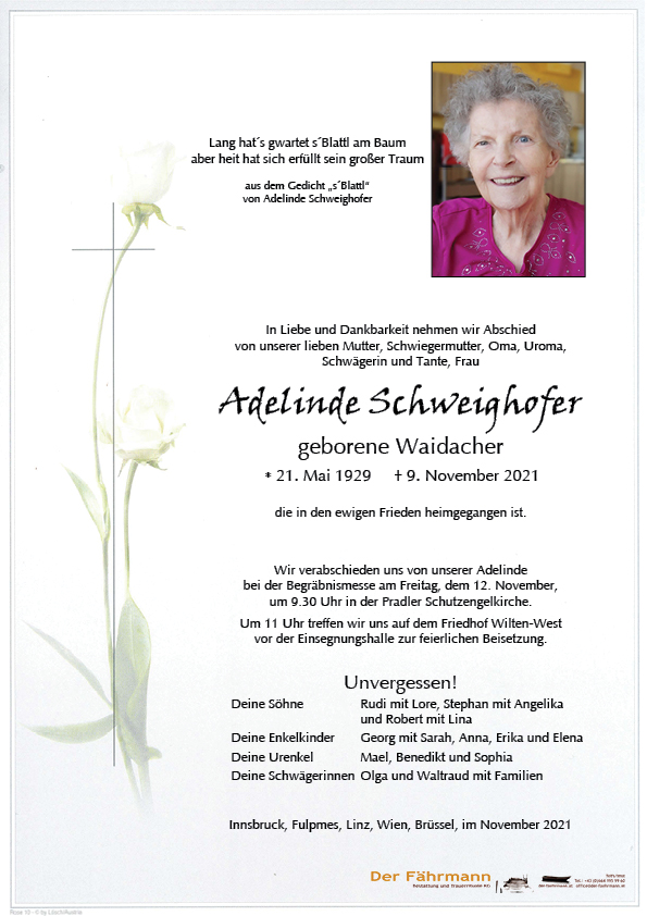 Schweighofer Adelinde 21.05.1929 09.11.2021 Innsbruck Beisetzungs-Ort: Friedhof Wilten-West Parte Gedenkkerzen Kondolenzen Parte downloaden Gedenkkerzen für Schweighofer Adelinde 8 Einträge Kerze anzünden A Liachtle aus Imst Wolfgang Köck Ruhe in Frieden Ruhin Frieden Gerda und Hansjörg Ruhe in Frieden Aufrichtiges Beileid Barbara & Martin Eine gute Überfahrt Bestattung DER FÄHRMANN Eine Kerze für Schweighofer Adelinde Ihr Name* Ihre Nachricht oder Name* E-Mail-Adresse* Mit dem Klicken auf "Kerze anzünden" erklären Sie sich mit unseren Datenschutzbestimmungen einverstanden. Kondolenzbuch für Schweighofer Adelinde 0 Einträge Kondolenz verfassen Ihr Abschiedsgruß an Schweighofer Adelinde Ihr Name* E-Mail-Adresse* Ihre Nachricht* Mit dem Klicken auf "Gruß absenden" erklären Sie sich mit unseren Datenschutzbestimmungen einverstanden. Schweighofer Adelinde 21.05.1929 – 09.11.2021 Parte Gedenkkerzen Kondolenzen Kerze anzünden Kondolenz verfassen