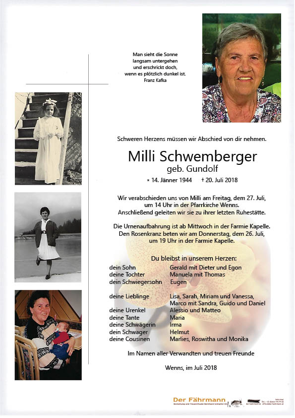 Liebe Mama, ich wollte dir noch so vieles sagen und noch viele schöne Stunden mit dir verbringen, so wie wir's im letzten Sommer noch gemacht haben. Aber der Herrgott hatte andere Pläne mit dir. Jetzt bist du hoffentlich wieder mit deinem Tatale vereint und es geht euch gut da wo ihr jetzt seit. Ich wäre so gerne bis zuletzt an deiner Seite gewesen, aber das war mir nicht vergönnt, dies wurde mir leider verwehrt. Umso schmerzlicher ist es jetzt für mich von dir Abschied zu nehmen. Ich danke dir von Herzen dass du immer ein offenes Ohr für mich hattest und stets für mich da warst. In meinem Herzen wirst du immer einen Platz haben und weiterleben.