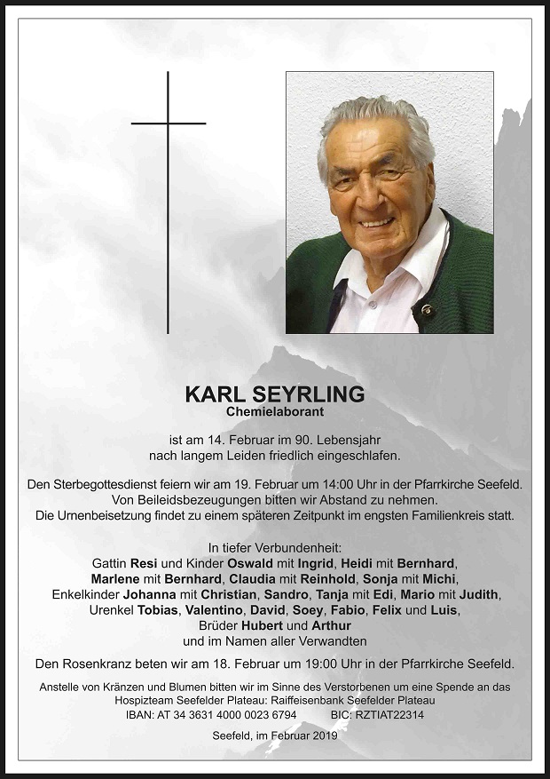 Seyrling Karl 11.01.1930 14.02.2019 Seefeld Beisetzungs-Ort: Waldfriedhof Seefeld Aufbahrungs-Ort: am Montag in der Aufbahrungshalle am Waldfriedhof Parte Gedenkkerzen Kondolenzen Parte downloaden Gedenkkerzen für Seyrling Karl 26 Einträge Kerze anzünden Ruhe in Frieden Sei geborgen bei Gott Ruhe in Frieden Heinz und Elke Ehwald Sozial- und Gesundheitssprengel Seefelder Plateau Ruhe in Frieden Renate und Hartl Ruhe in Frieden Martina mit Sandro A Liachtl für di aus der Leutasch,Irene mit Fam. Im stillen Gedenken! Marion Köll Fam.Unterwurzacher Günter Ruhe in Frieden Ruhe in Frieden Adele mit Familie Ruhe in Frieden Deine Nichte Renate m. Familie Ingrid Rieck Ruhe in Frieden, Familie Beirer und Florio Ruhe in Frieden, Pauli & Barbara, Leutasch Seniorenresidenz Seefeld Ruhe in Frieden Brand Marlene Ruhe in Frieden Renate Menardi Erwin und Andrea Neuner Ruhe in Frieden Veronika aus Pfaffenhofen Ruhe in Frieden! Familie Leitner Ruhe in Frieden Wolfgang Köck RUHE IN FRIEDEN MEGGI eine gute Überfahrt Bestattung DER FÄHRMANN Eine Kerze für Seyrling Karl Ihr Name* Ihre Nachricht oder Name* E-Mail-Adresse* Mit dem Klicken auf "Kerze anzünden" erklären Sie sich mit unseren Datenschutzbestimmungen einverstanden. Kondolenzbuch für Seyrling Karl 0 Einträge Kondolenz verfassen Ihr Abschiedsgruß an Seyrling Karl Ihr Name* E-Mail-Adresse* Ihre Nachricht* Mit dem Klicken auf "Gruß absenden" erklären Sie sich mit unseren Datenschutzbestimmungen einverstanden. Seyrling Karl 11.01.1930 – 14.02.2019 Parte Gedenkkerzen Kondolenzen Kerze anzünden Kondolenz verfassen