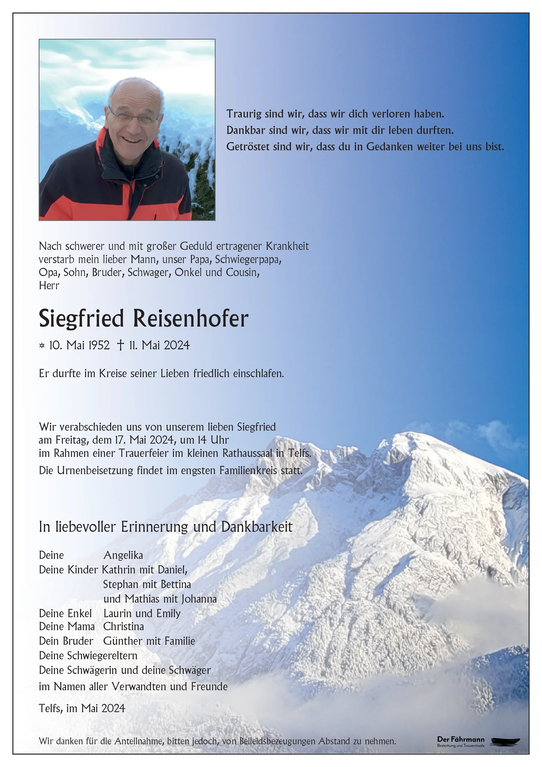 Wir möchten euch unser tiefstes Mitgefühl zum Tode von Siegfried aussprechen und euch allen Trost, viel Kraft und Zuversicht wünschen in dieser unendlich schweren Zeit der Trauer und des Abschieds.