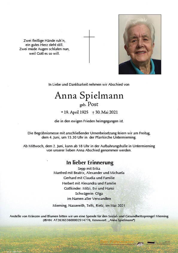Aufbahrungs-Ort: in der Aufbahrungshalle Untermieming ab Mi. 2.6.2021 18.00 Uhr