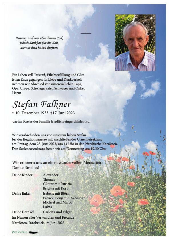 Lieber Stefan, ruhe in Frieden. Ich denke oft an die schöne Fahrt mit Dir ins Elsaß anlässlich eines Betriebsausfluges mit den Kolleginnen und Kollegen der BTV Imst.