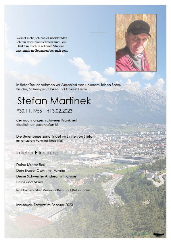 Stefan Martinek 30.11.1956 13.02.2023 Tarrenz Beisetzungs-Ort: Pfarrfriedhof Tarrenz Aufbahrungs-Ort: keine Aufbahrung Parte Gedenkkerzen Kondolenzen Parte downloaden Gedenkkerzen für Stefan Martinek 96 Einträge Kerze anzünden A Osterkerzl für di ?️ A Liechtle für di ✨️ A Weihnachtskerzl für di ?️ A Allerheiligenkerzl für di ?️ A Kerzle für mein Bruder und Onki? A Osterkerzl für di ?️ Du Fehlst uns Allen A Neujahrskerzl für di ✨ A Weihnachtskerzl für di ⭐ A Liechtle für di ✨️ A Liechtle für di ✨️ A Liechtle für di ✨️ A Lichtl für di Sibylle und Manfred Gritsch A Liechtle aus Niederthai A Liachtl Für di A Kerzle aus Niederthai A Kerzle aus Niederthai Ruhe in Frieden A Lichtlein aus Tarrenz Kurt und Annett Ruhe in Frieden Jahrgang 1956 Martina Demml mit Familie A Lichtlein aus Tarrenz Ruhe in Frieden Ruhe in Frieden Ruhe in Frieden Helga Inge Dagmar mit Fam. Ruhe in Frieden! Dagmar A Lichtl aus Innsbruck Philip Tobias Bruder Ossi und Irene Ruhe in Frieden Richard u.Erika Jürgen und Raphaela Elisabeth und Albert Haselwanter Elisabeth und Albert Haselwanter Fam. Thomas und Lydia Walch Aufrichtige Anteilnahme Tilli, Karin u. Marie Stigger Hannes m.Fam. Inge und Alfred Köll Fam. Flür Fritz und Marlies Sibylle und Manfred Gritsch A Liachtli für deine Reise Tangl Anneliese Gib ihm die Ewige Ruhe A Liachtl für di Josef und Edelgard Ruetz Norbert und Bettina Ruetz Norbert und Bettina Ruetz Norbert und Bettina Ruetz Norbert und Bettina Ruetz Norbert und Bettina Ruetz Ruhe in Frieden Stefan Ruhe in Frieden Reinhard & Gabi Juen Fam. Happacher Manfred u. Margarete Ruhe in Frieden! Simone, Stefan, Hannah, Marcel und Benni Gute Reise Elli Strad Gute Reise Elli Strad Gute Reise Elli Strad Gute Reise Elli Strad Gute Reise Elli Strad Alfred NEURAUTER A Lichtl für di Stefan Inge u. Harald Happacher Inge u. Harald Happacher Inge u. Harald Happacher Ruhe i. Frieden! Fam. Maria u. Karl Doblander Ralf, Hanni, Martin und Melanie Aufrichtige Anteilnahme, Mary, Aileen und Mike Kirschner Gute Reise Stefan Fam. Thomas & Renate Ruetz Fam. Thomas & Renate Ruetz Fam. Thomas & Renate Ruetz Ruhe in Frieden Claudia Ritzinger Stefan und Manuela Rueland Ruhe in Frieden! Alfred und Annamarie Doblander Aufrichtige Anteilnahme Martina Demml mit Familie Ruhe in Frieden, Rosemarie. Ruhe in Frieden, Rosemarie. Herzliches Beileid Fam. Ladstätter Dagmar Huber Oswin und Andrea Ruhe in Frieden. Walter u. Traudl Alfred NEURAUTER Fam. Philipp und Harald Happacher Ruhe in Frieden Familie Werner Gstrein R.I.P. Stefan. Mani Wegleiter, Schulkollege aus Haiming Melanie und Christoph Westreicher Ruhe in Frieden Frieda Köll Ruhe in Frieden Martha Köll Familie Santer Hansjörg& Barbara Fam.Huber Manfred & Helga Fam. Zoller Robert Ein Licht für deine letzte Reise Fam Singer W der Herr ist mein Hirte nichts wird mir fehlen! Eine gute Überfahrt wünscht Bestattung DER FÄHRMANN Eine Kerze für Stefan Martinek Ihr Name* Ihre Nachricht oder Name* E-Mail-Adresse* Mit dem Klicken auf "Kerze anzünden" erklären Sie sich mit unseren Datenschutzbestimmungen einverstanden. Kondolenzbuch für Stefan Martinek 0 Einträge Kondolenz verfassen Ihr Abschiedsgruß an Stefan Martinek Ihr Name* E-Mail-Adresse* Ihre Nachricht* Mit dem Klicken auf "Gruß absenden" erklären Sie sich mit unseren Datenschutzbestimmungen einverstanden. Stefan Martinek 30.11.1956 – 13.02.2023 Parte Gedenkkerzen Kondolenzen Kerze anzünden Kondolenz verfassen