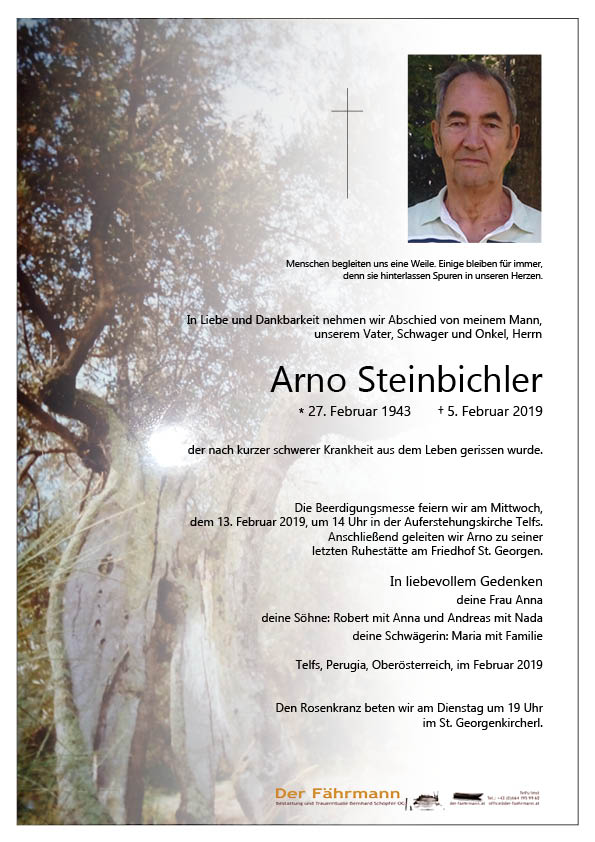 Liebe Trauerfamilien, stille herzliche Anteilnahme am Heimgang von ARNO - entbietet Familie Peter & Irmi KLIEBER Wir werden ARNO als sympathischen angenehmen Nachbarn & Menschen in Erinnerung behalten!