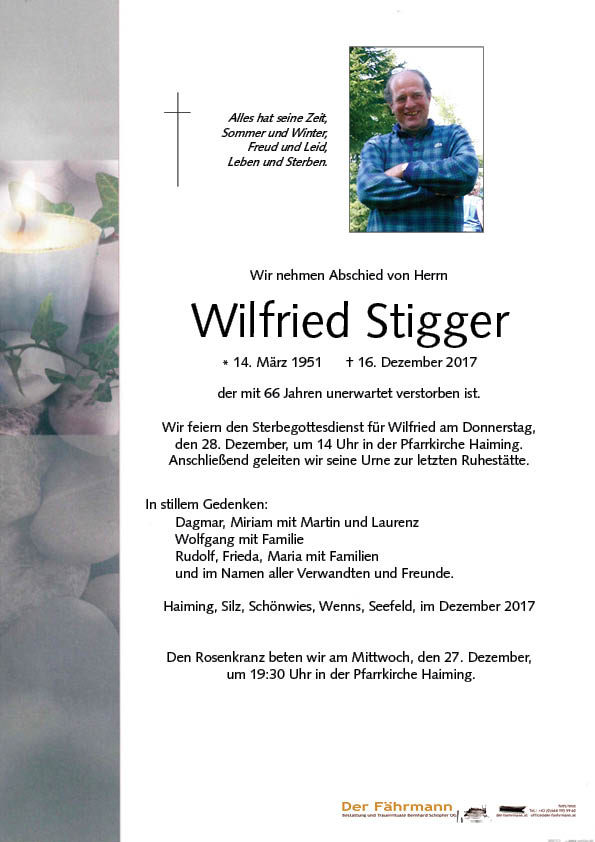 Stigger Wilfried 14.03.1951 16.12.2017 Haiming Beisetzungs-Ort: Friedhof Haiming Aufbahrungs-Ort: Aufbahrungshalle Haiming Parte Gedenkkerzen Kondolenzen Parte downloaden Gedenkkerzen für Stigger Wilfried 122 Einträge Kerze anzünden Wolfgang Köck Beate Enzinger ingrid juen Fam Palfinger Physiotherapie Team Neurauter-Schwarz Lydia mit Fam Jürgen Neumayr samt Team der ÖBB Martina, Julia und Philipp Pali Marianne und Stefan Reheis Ruhe in Frieden Helmut Reichegger Danke u. Ruhe in Frieden! Loy Kordula Frieda Ritsch-Zoller Marion und Wilfried mit Familie Hanspeter und Waltraud Köll In stillem Gedenken dein Kollege Gratl Pepi mit Manuela Schatz Patricia mit Rene Fam.Palfinger Toni u. Armella Palfinger Kassegger Hartmut u. Edith Fam. Messenger Hartmut u. Edith Wedam Andrea Fam. Ambrosi Franz Ruhe in Frieden! Fam. Siegfried und Hanni Stigger Bruno und Friederike Raffl Robert und Nadja Reindl, Mötz Fam. Thomas und Gabi Costa Gute Reise Ruhe in Frieden Thomas u. Christine Hairer Fam. Angela Haslwanter Dagmar und Josef Mader Fam. Annemarie Hasel Ruhe in Frieden. Herta Ruhe in Frieden, Martin / Silz Wendelin Juen Team Gutmann Ötzaler Höhe Fam.Stigger Mario Fam. Andreas und Martina Raffl A Liachtla aus Wenns R.I.P.! Gebhart Christl Stigger Dominik Stigger Elisabeth Fam.Avdibasic R.I.P Felix Neururer Familie Werner Nagele Fam. Richard Walser Fam. Gritsch Claudia Ruhe in Frieden. Deine Nachbarn Helmut und Uschi Ruhe in Frieden !Waltraud Raggl Fam. Hansjörg Schumacher Martha & Hans Muigg Martha & Hans Muigg A Liachtl aus Wenns. ... Ruhe in Frieden Wolfgang, Sibylle, Lena und Jakob Helmut Köck Maria Floriani Fam.Margit Floriani Fam.Margit Floriani Fam.Föger Franz u. Romana Fam.Flunger Bernhard u.Erika Deine Nachbarn Wolfi und Geli Deine Nachbarin Wilma Deine Nachbarin Tamara und Rene mit Kindern Fam.Helmut u.Angelika Stigger Die Nachbarn Rosi und Egon Deine Nachbarn Stefan, Daniela und Julian Christine u.Christian Praxmarer Fam. Michael Perwög Silvio Böck Klemens RIta u. Hubert Stigger Fam. Markus u. Catrin Raffl Bruno&Reingard Neuner Fam. Hannes u. Barbara Stigger Hannes und Annemarie Andrä und Andrea mit Jakob und Josephine Hans u. Helga Hairer Fam. Erich und Rosa Redolf Miriam und Martin für OPA von Laurenz Roswitha u Pepi Muglach Kurt und Annelies Kapeller Gebhard und Inge Neurauter Mareiler Bruno u. Barbara Fam. Muglach Edwin Ruhe in Frieden Gerda Muglach Kerstin Günter, Christa und Günter Marianne und Luis Waldhart Viktoria Neururer Annemarie Neururer Hannes mit Familie R.I.P. Elisabeth Stroj m. Fam In stillem Gedenken. Gerda und Peter,Anna und Manni mit Fami Gernot u. Petra Perwoeg Obstbaukollege Mani Wegleiter m. Fam. Fam. Floriani Albert u. Nicole Fam. Bernd und Carmen Kapeller Sylvia und Josef mit Maria-Anna und Philip Martha und Erwin Kreisern Fam. Löffler Gerhard und Inge Rosina u. Peter Strigl Fam. Karl und Martina Föger Fam. Gerda u. Herbert Kolb Ruhe in Frieden. Alexandra und das Obstlager-Team Pepi u, Erika Eisenbeutl Müh´und Arbeit war dein Leben, treu und fleißig deine Hand. Deine ganze Kraft hast du für uns gegeben, nun schlafe wohl, hab´tausend Dank. Familie Romana und Lois Neurauter Familie Karl und Lisi Allneider Fam. Bernhard u. Barbara Haslwanter Raffl Werner & Renate Hedy und Myriam Haslwanter Helga Hanin Fam .Peter u. Dora Stigger Marialuise Holzknecht Fam. Hannes Kapeller Imkerverein Haiming eine gute Überfahrt Bestattung DER FÄHRMANN Eine Kerze für Stigger Wilfried Ihr Name* Ihre Nachricht oder Name* E-Mail-Adresse* Mit dem Klicken auf "Kerze anzünden" erklären Sie sich mit unseren Datenschutzbestimmungen einverstanden. Kondolenzbuch für Stigger Wilfried 0 Einträge Kondolenz verfassen Ihr Abschiedsgruß an Stigger Wilfried Ihr Name* E-Mail-Adresse* Ihre Nachricht* Mit dem Klicken auf "Gruß absenden" erklären Sie sich mit unseren Datenschutzbestimmungen einverstanden. Stigger Wilfried 14.03.1951 – 16.12.2017 Parte Gedenkkerzen Kondolenzen Kerze anzünden Kondolenz verfassen