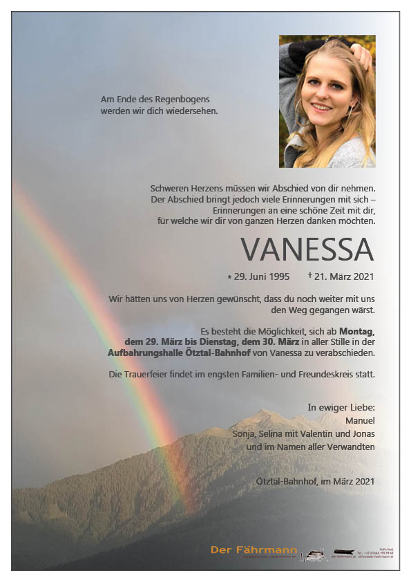 Jesus Christus spricht: "Gott, in Deine Hände befehle ich meinen Geist", und auch zu dir, liebe Vanessa, sagt er: "Heute noch wirst du mit mir im Paradiese sein!" Der Trauerfamilie wünschen wir Kraft für diese schwere Zeit. In stiller Anteilnahme, Richard und Mechthild Rotter