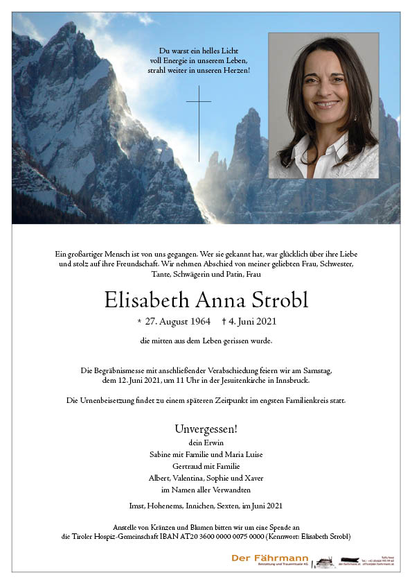Sie musste in ihrem Leben viele Schicksalsschläge meistern, trotzdem ist sie lebendbejaend, fröhlich und stark geblieben. Ich habe sie als SISA kennengelernt, als die talentierte, patente Südtirolerin. Wir haben lustige Zeiten in Amerika verbracht, am Strand, beim Laufen, wo wir Beide ganz anders sein konnten als in Europa... befreit! Aber alle Erinnerungen an Elisabeth enden gleich: mit einem unglaublich warmen Gefühl im Bauch. Sie bleibt als heller Stern am Himmel unter uns! Liebe Sisa, Pfiat di! Ich werde an dich denken, wenn ich in den Himmel schau. Brigitte