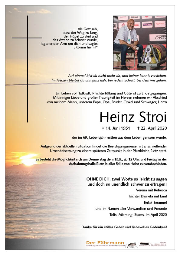 lieber Heinz Meist sonntags trafen wir uns bei der hl.Messe in der Hl.Geistkirche. es war dir ein Bedürfnis mit deiner Frau und deiner Tochter dabei zu sein.Ruh in Frieden,Heinz! Christl,eine Rietzerin.