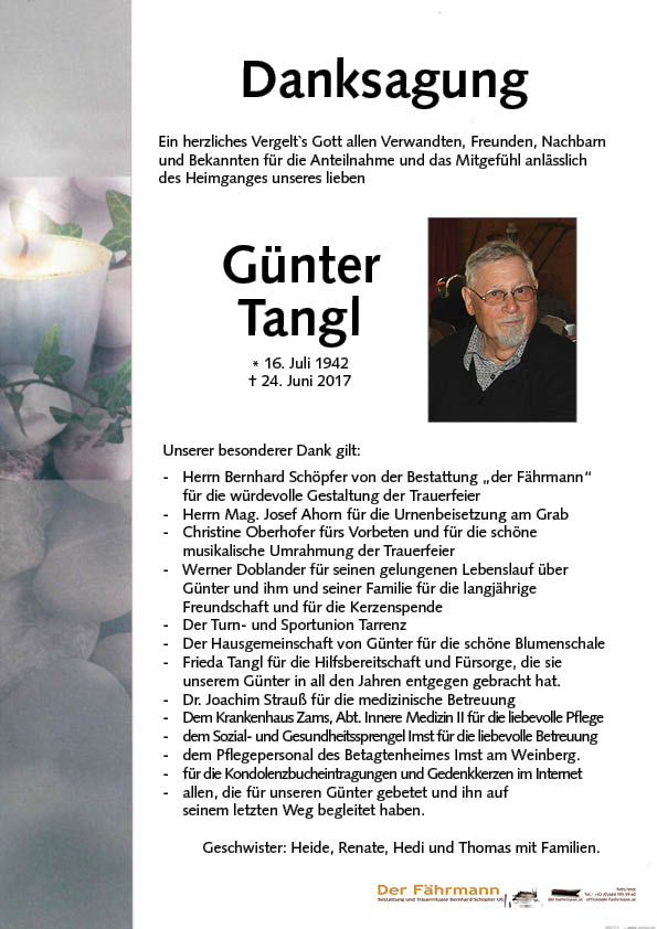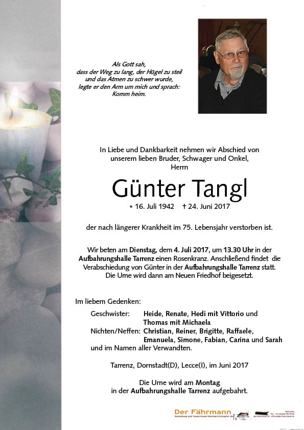 Günter moch`s guat. Wir werden noch oft an die schönen gemeinsamen Stunden und Urlaube, die wir mit dir verbracht haben, denken.